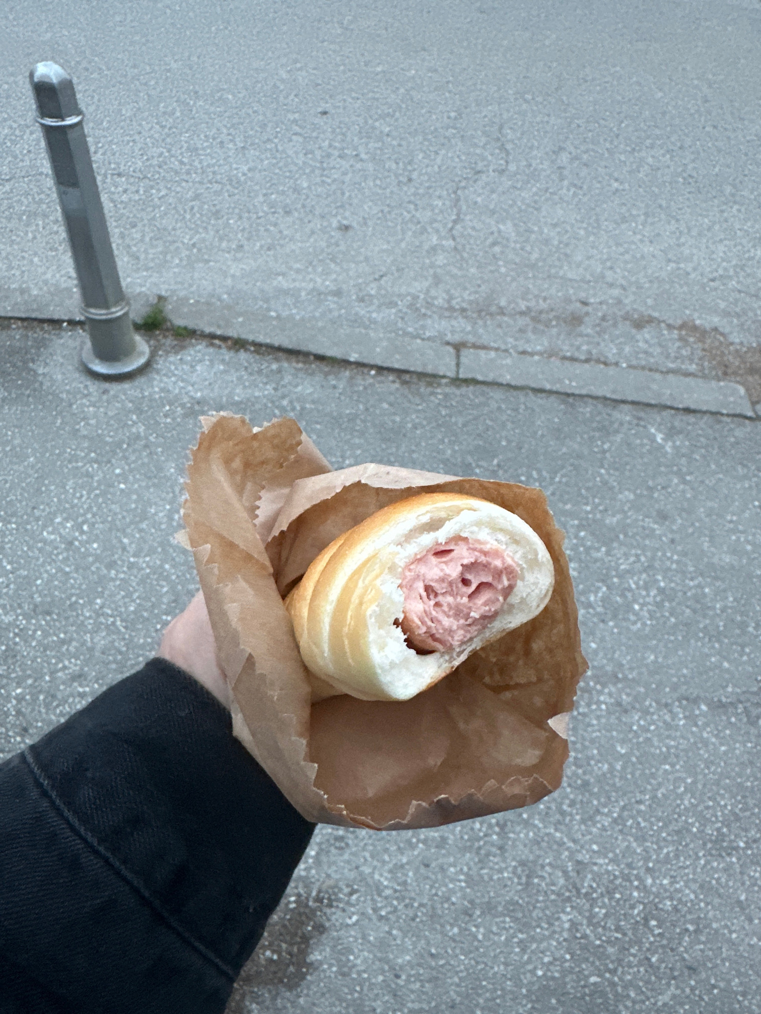 A person is holding a cut-off hot dog in a paper bag. The person is wearing a black denim jacket. The background is a sidewalk in Zagreb, Croatia, with a metal barrier pole visible.