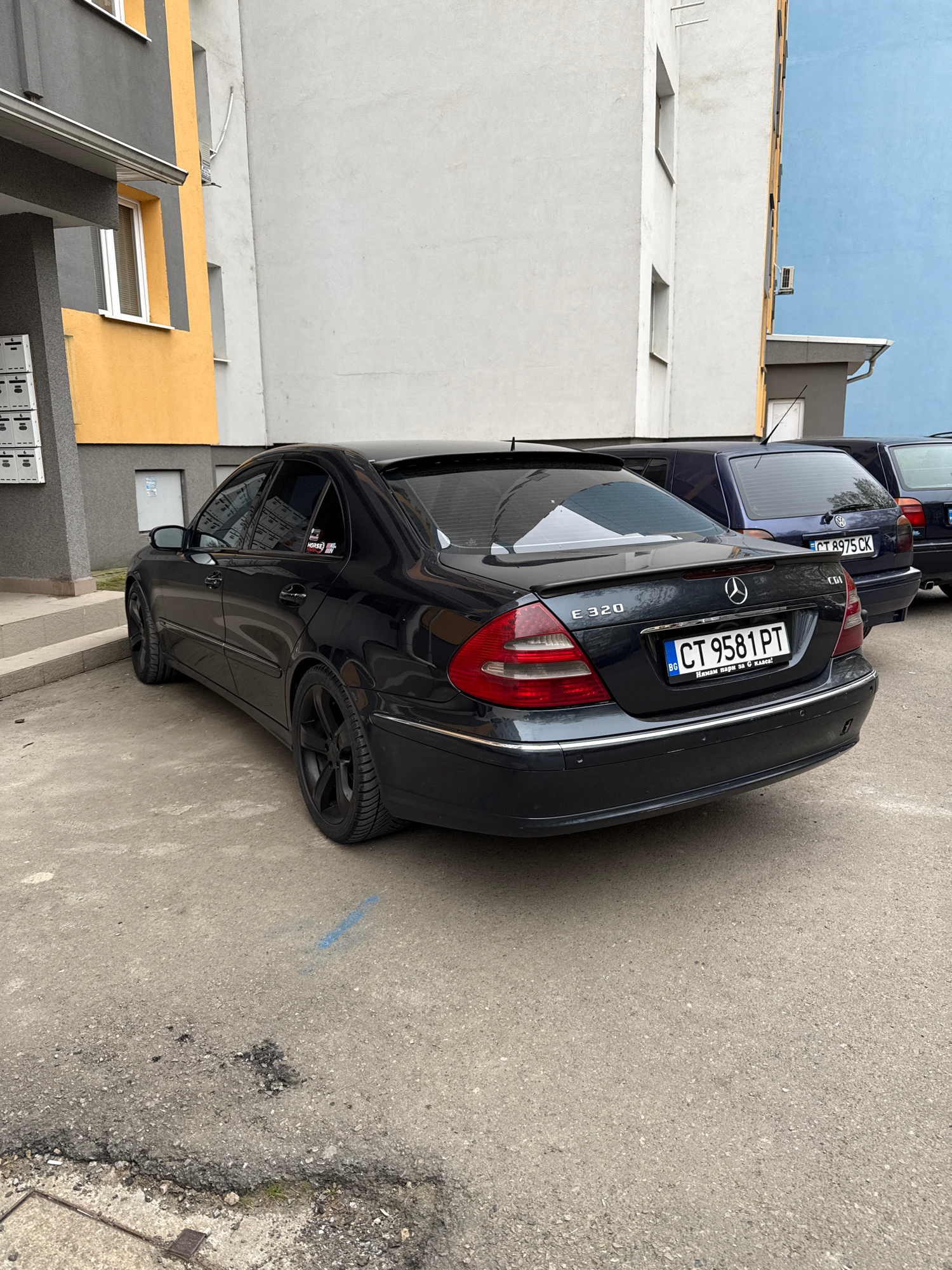 The image shows two parked cars on a street. The foreground car is a black Mercedes-Benz E320 with Bulgarian license plate CT 9581 PT, with a bumper sticker that translates to "I don't have money for…read more
