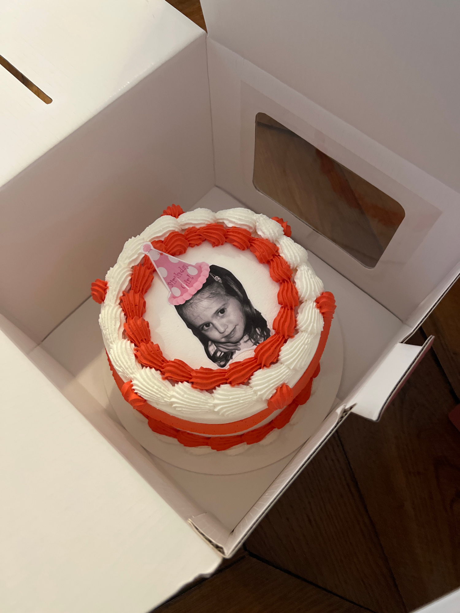 The image shows a round birthday cake inside an open white cardboard box. The cake has white frosting with red decorative piping along the edges. A black-and-white photograph of a child's face is plac…read more