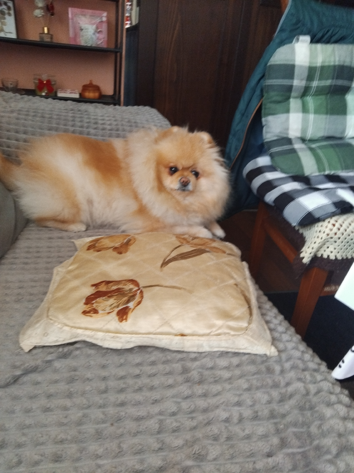 The image, oriented vertically, captures a fluffy Pomeranian dog with light orange and cream-colored fur, resting on a textured gray blanket. The dog's head is slightly tilted, and its dark eyes are l…read more