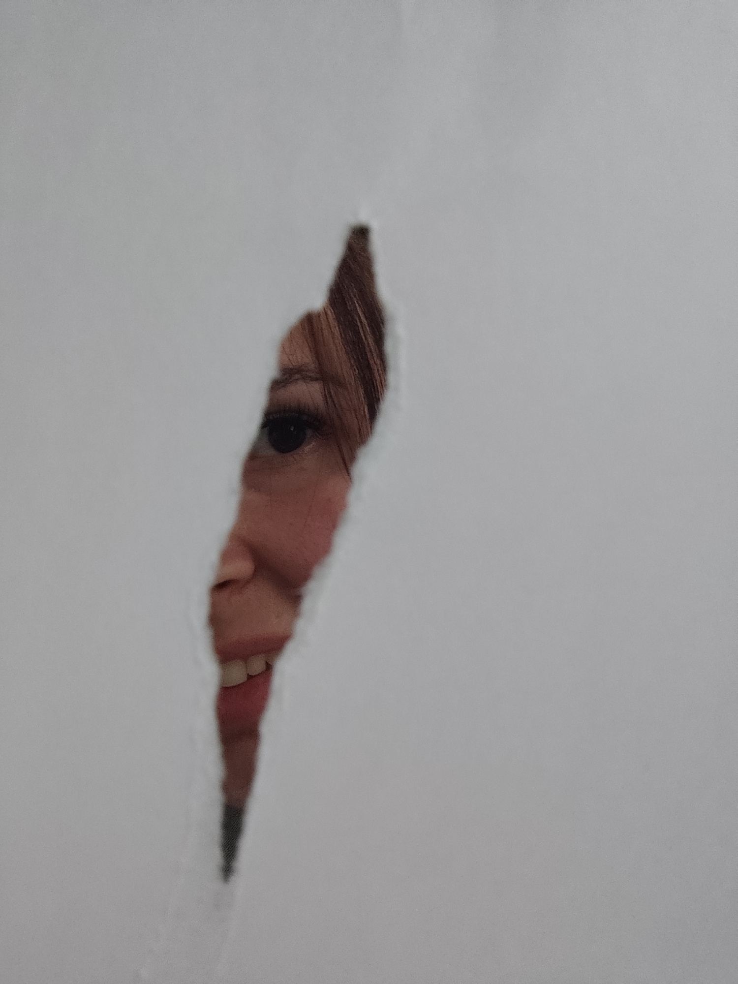 A partial view of a person's face is visible through a torn piece of white paper. The visible portion of the face includes an eye, nose, mouth with teeth, and part of the hair. The background is indis…read more