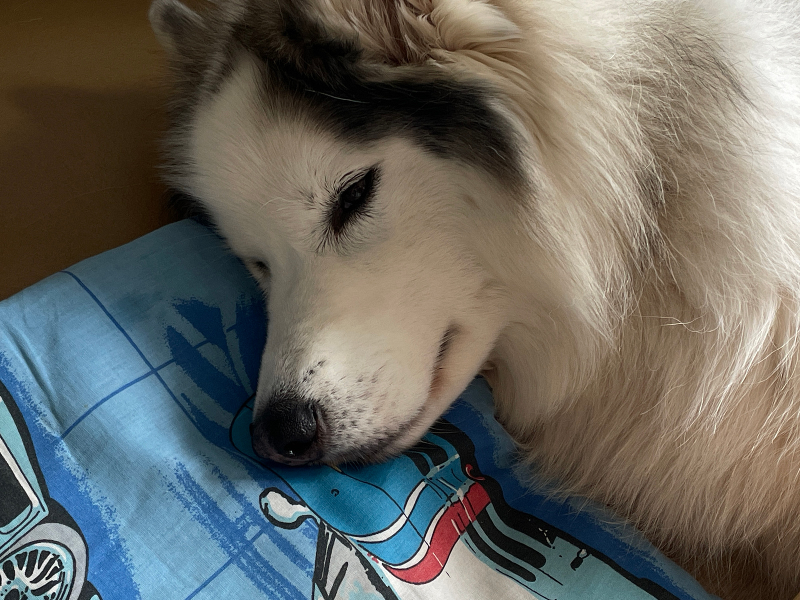 A close-up depicts a white and grey husky dog resting its head on a blue pillow. The dog has black markings above its eyes and a black nose. The pillow has a pattern featuring lines and a depiction ofโฆread more