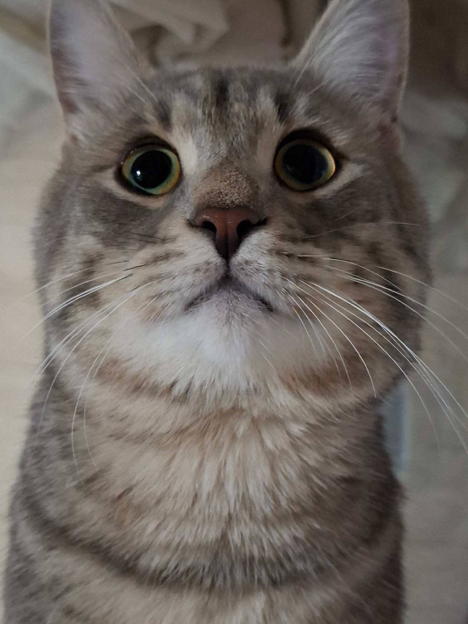 The image presents a close-up, high-angle portrait of a domestic short-haired cat, its head tilted, looking directly at the viewer. The cat has a beautiful tabby coat, displaying a pattern of grey andβ¦read more