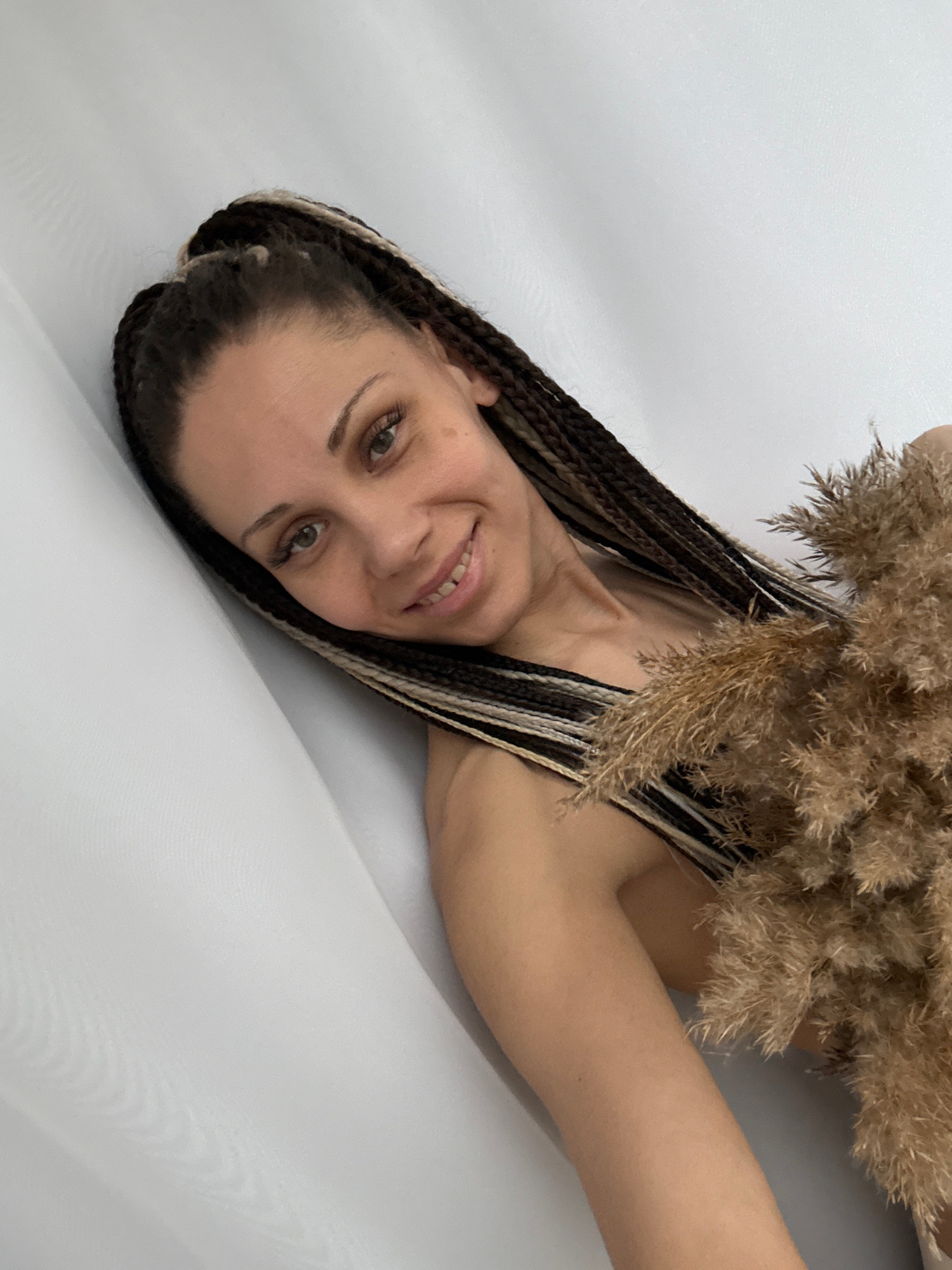 A person with braided hair is lying on a white surface, holding a bunch of dried plants in front of them. The location is not specified in the prompt, only Rusanovo, Russia is.
