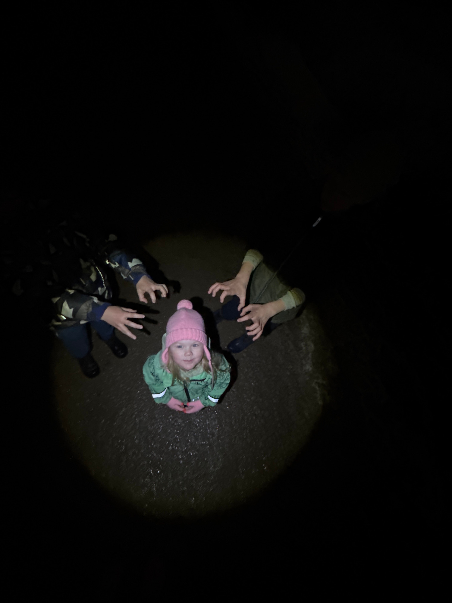 The image appears to be taken from a high angle in a dark outdoor environment. A child wearing a pink hat and green jacket is illuminated by a bright light source. Two other sets of limbs are visible…read more