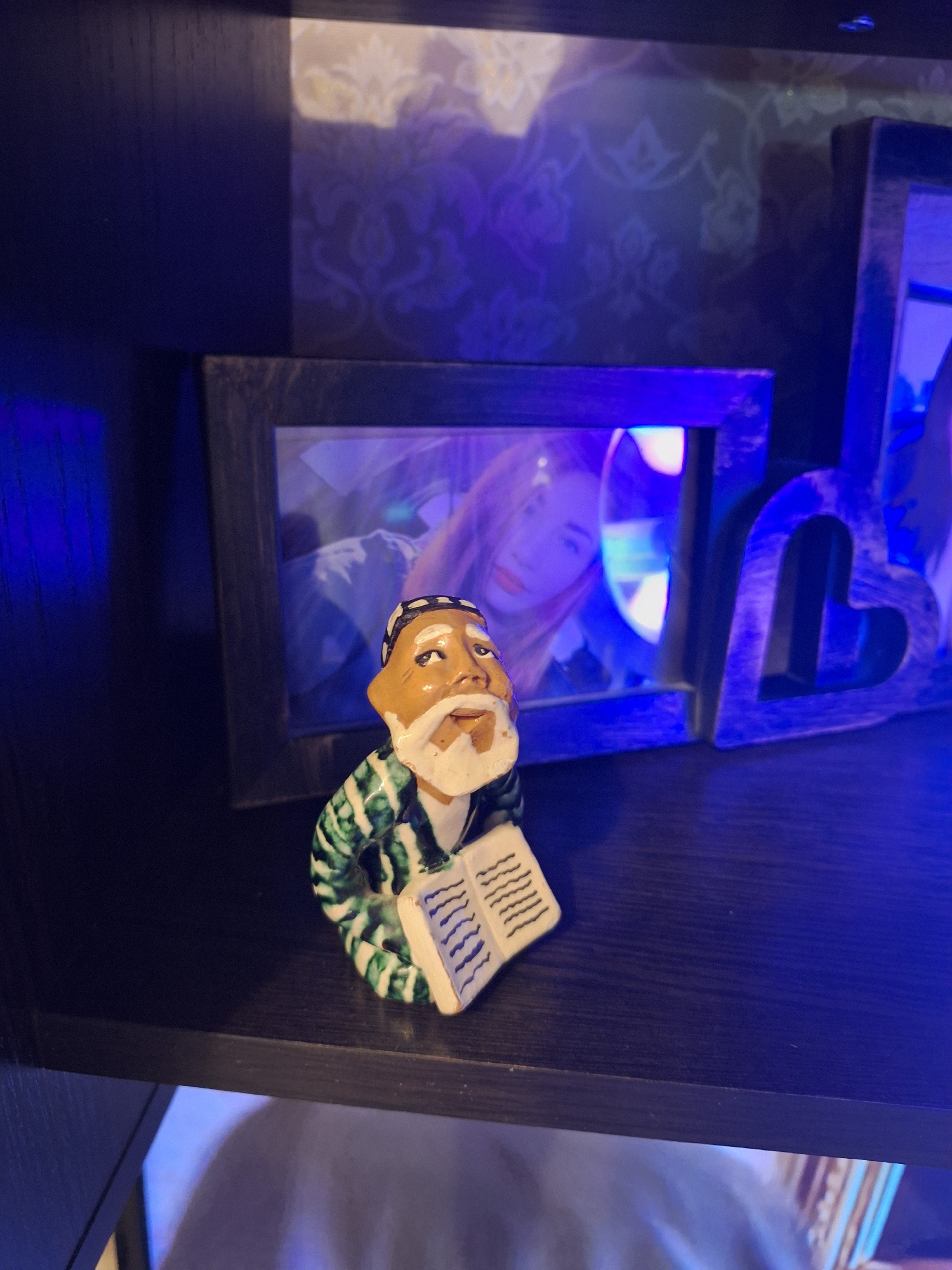 The image displays an indoor scene characterized by dark wooden elements and striking blue artificial lighting. In the foreground, a ceramic figurine of a man is affixed to a dark wooden column or fraβ¦read more