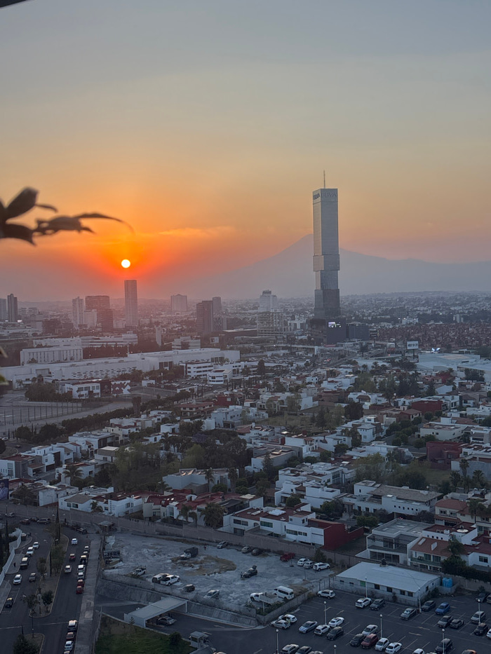 A cityscape captured at sunset with orange and yellow hues dominating the sky. A towering skyscraper stands out against the gradient sky, and a mountain range is visible in the background. A dense res…read more