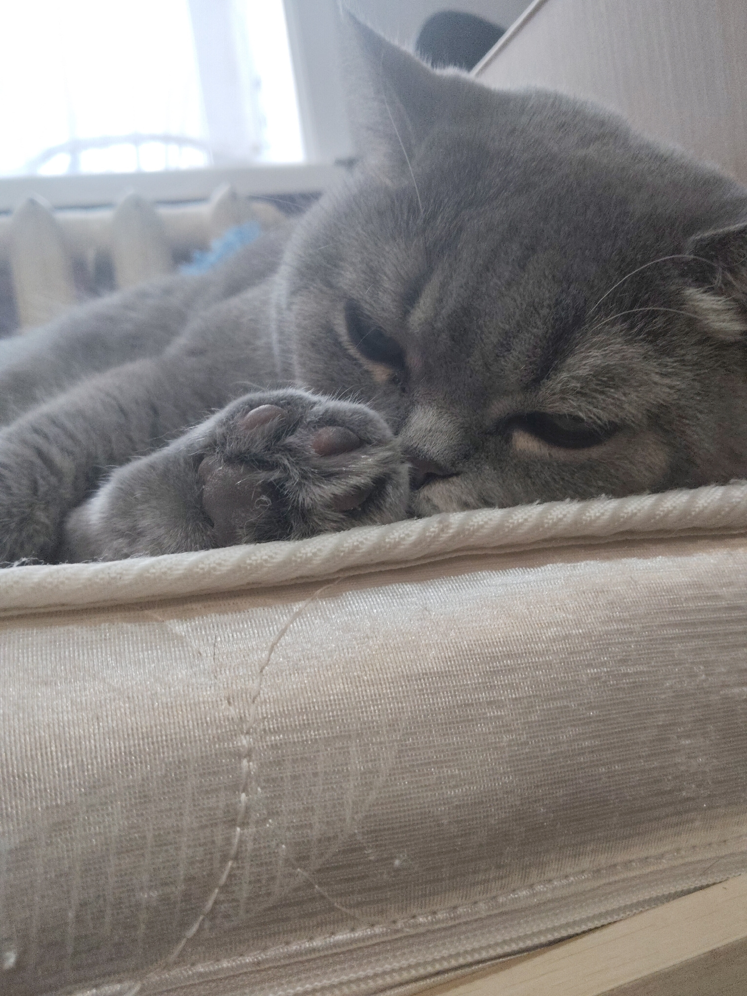 A grey cat, likely a British Shorthair given its distinctive round face and dense fur, is captured in a close-up, horizontal shot. The cat is resting or sleeping, with its eyes mostly closed and its h…read more