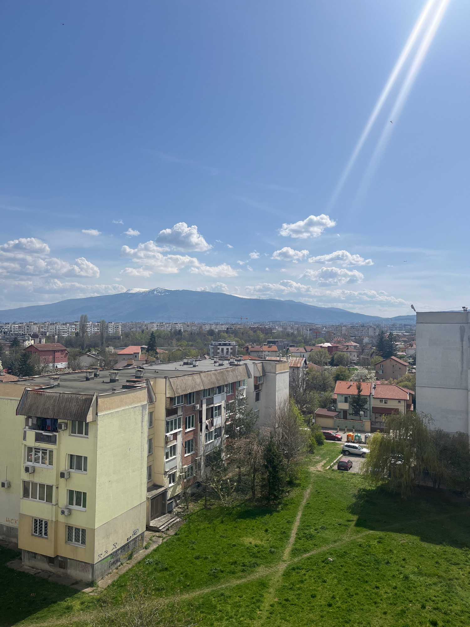 The image captures a high-angle, wide view of a residential area in Sofia, Bulgaria, under a bright blue sky. In the immediate foreground, a vibrant green grassy area stretches across the right side,…read more