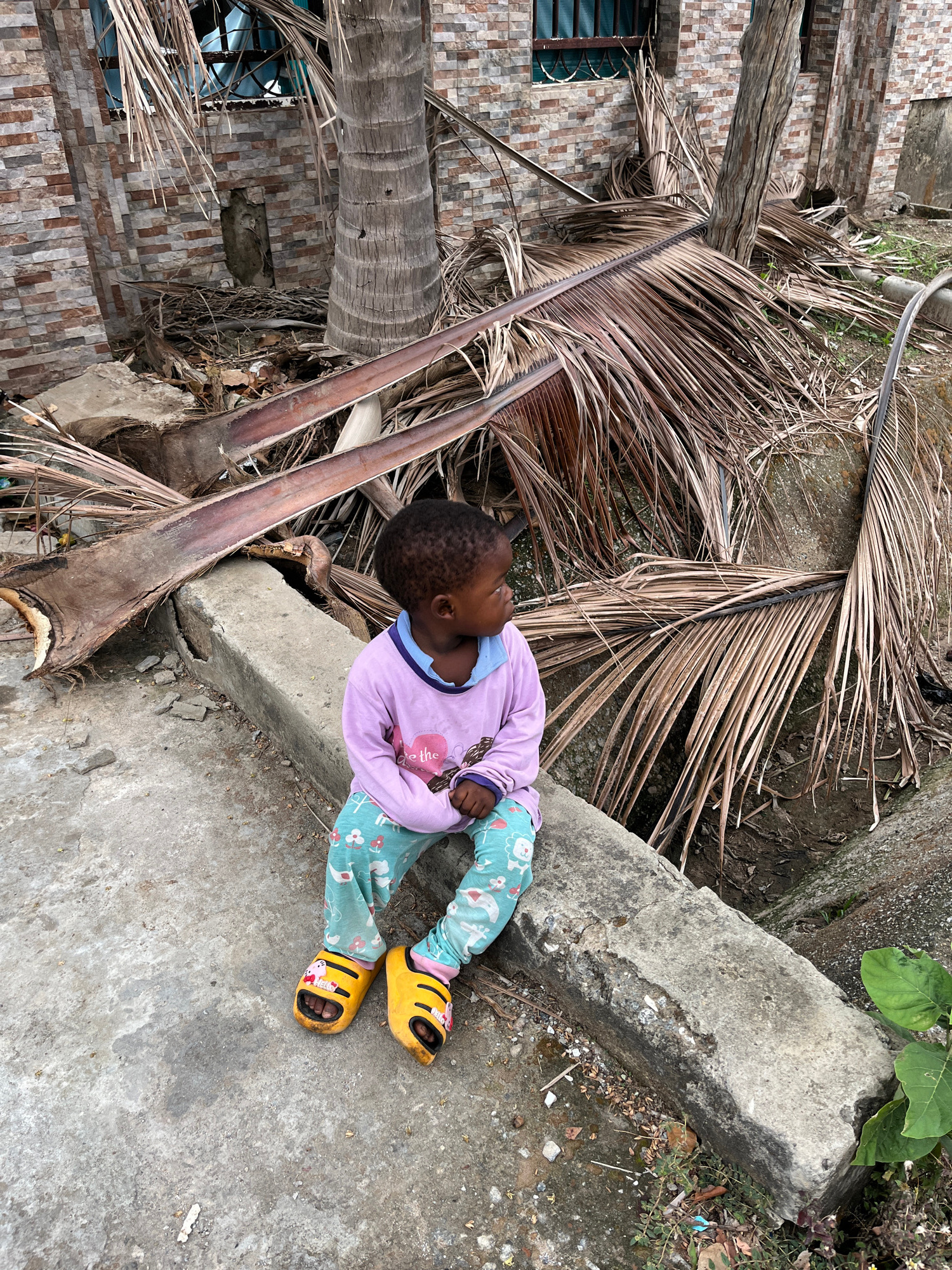 A young child wearing a purple long-sleeved shirt, patterned light blue pants, and yellow sandals sits on a concrete structure. Dried palm fronds and sections of palm trunks are scattered nearby. In t…read more