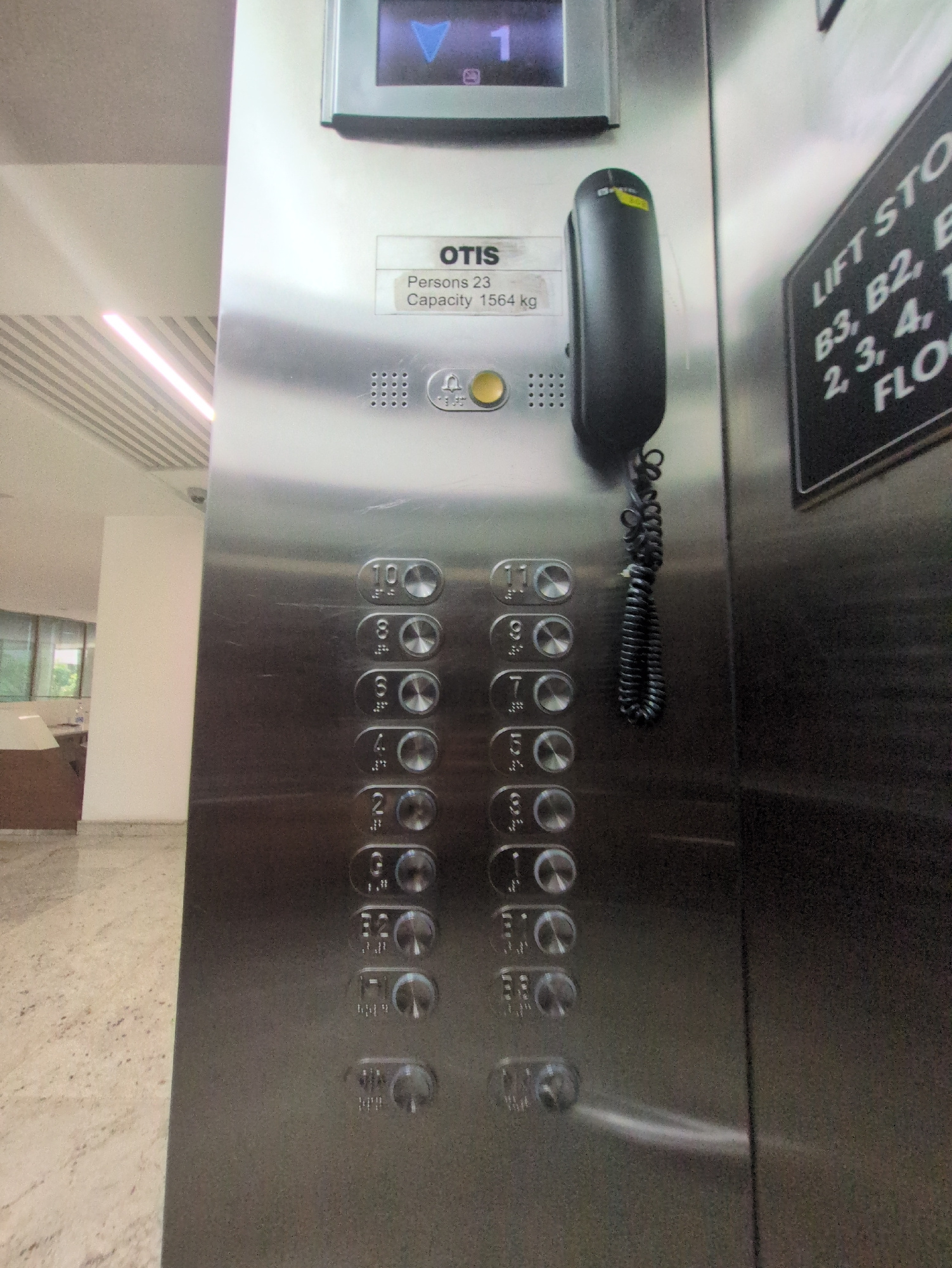 The image shows the control panel of an Otis elevator. The panel is made of brushed metal and includes a display screen with an upward-pointing arrow, indicating the elevator's current direction. Next…read more