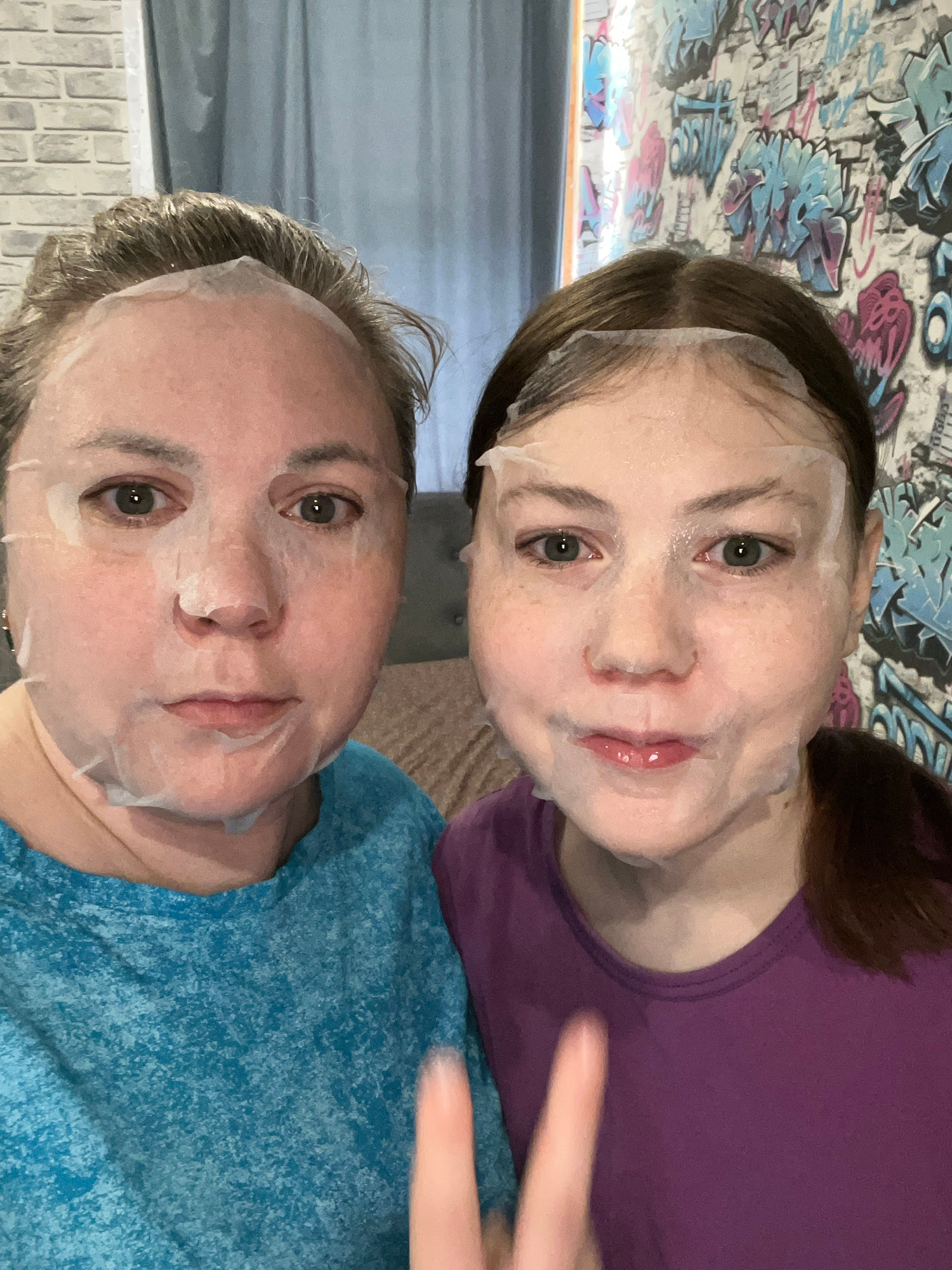 Two individuals are visible in the image, both wearing facial masks. The person in the foreground is wearing a blue top, while the person in the background is wearing a purple top. The background behi…read more