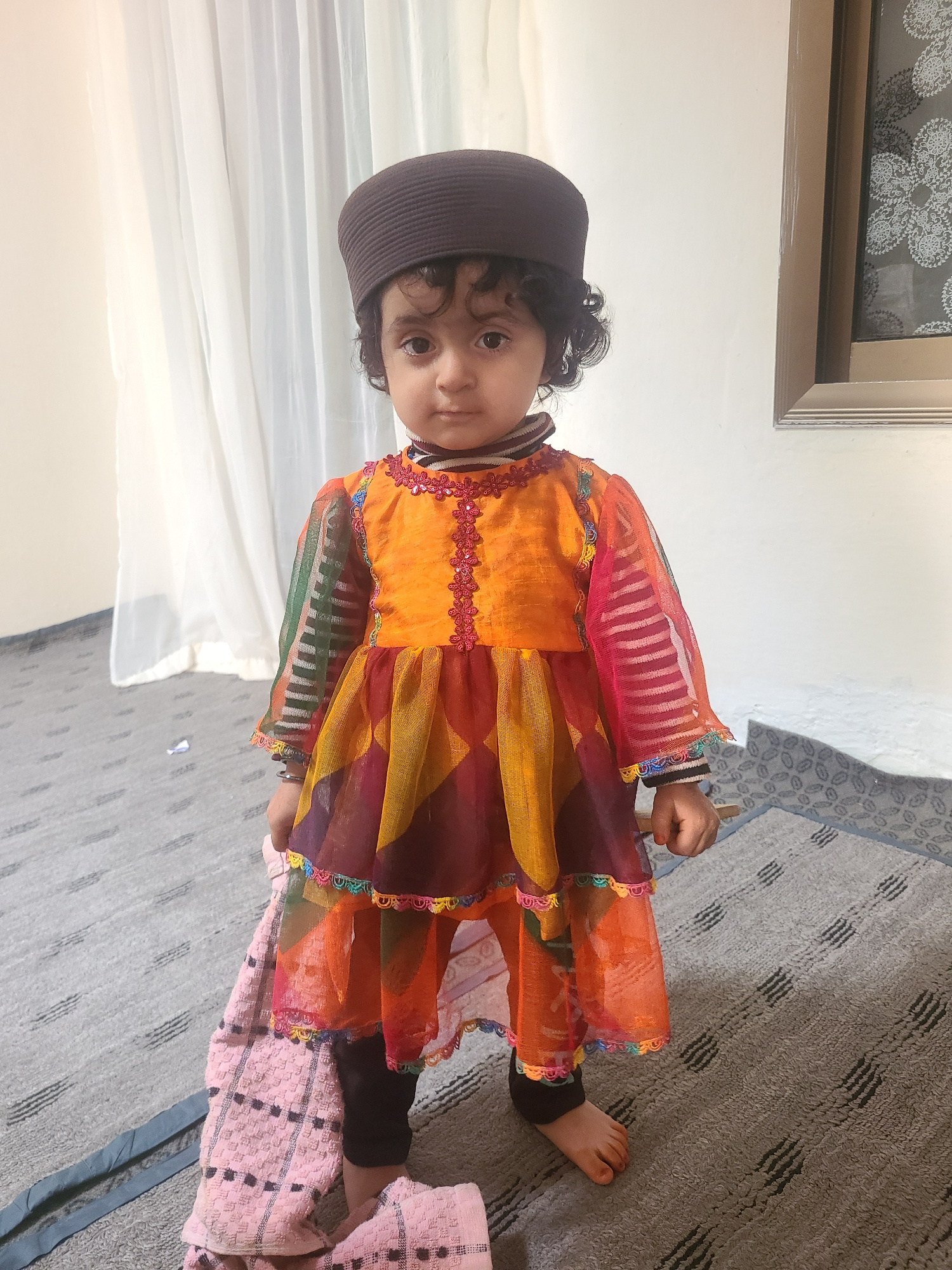 A child wearing a colorful dress and a dark cap stands in a room. The dress is multi-colored with orange, red, yellow, and purple sections. The child has dark hair and is looking directly at the camer…read more