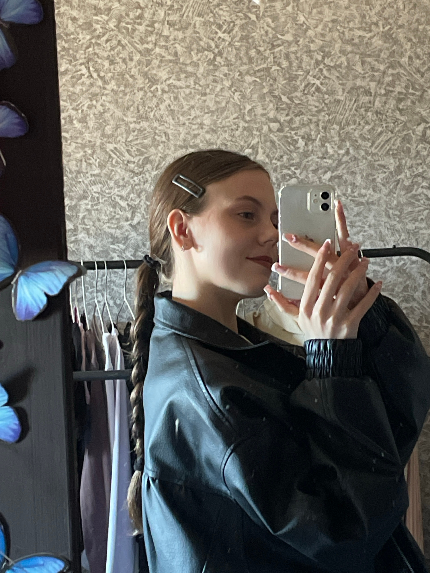 A woman is taking a selfie with her phone in front of a textured wall. She is wearing a black leather jacket. Her hair is braided and has a silver hair clip. In the foreground, there are decorations o…read more