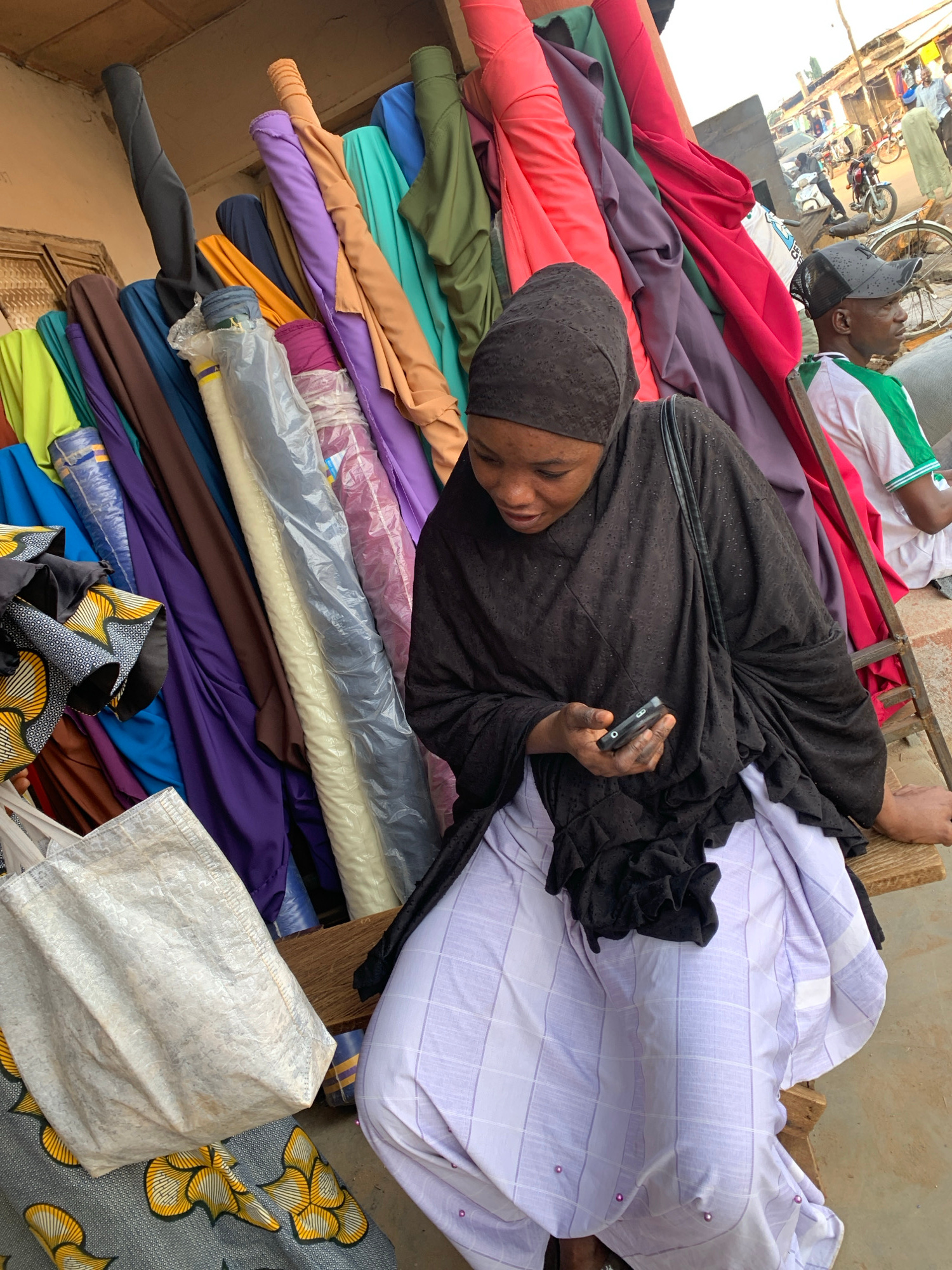 The image depicts a woman in Kafanchan, Nigeria, amidst a vibrant textile market. She is lying on a stack of colorful fabric rolls, using a mobile phone. The textiles vary in color and pattern, rangin…read more