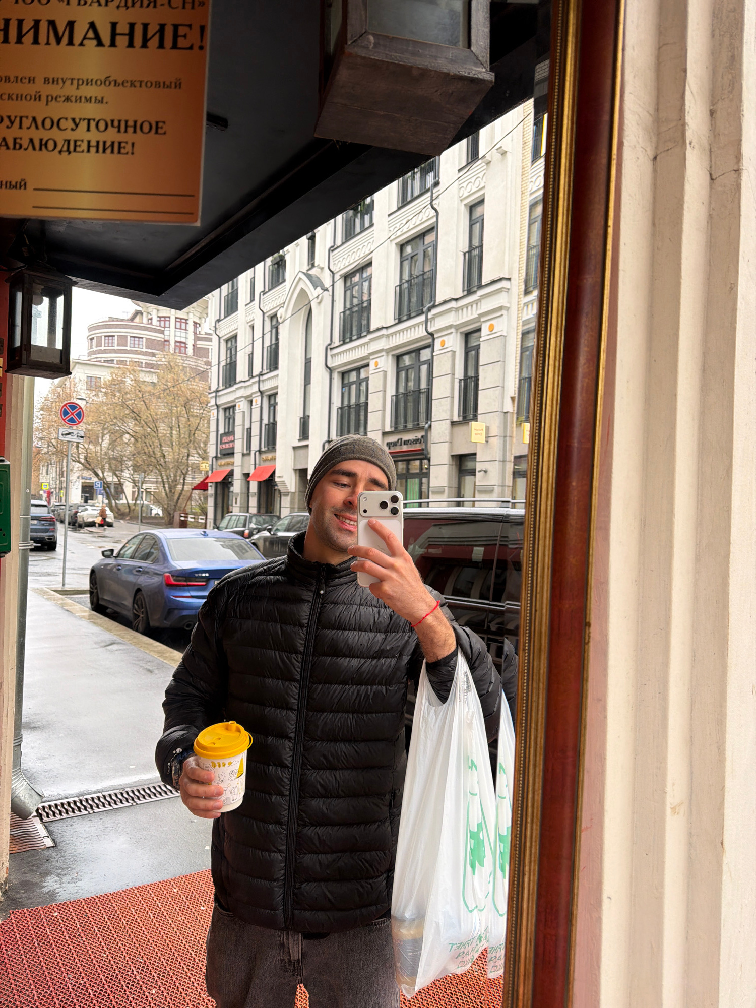 Here is a concise description of the image: The image is a selfie taken in a mirror's reflection on a street in Moscow, Russia. A man wearing a dark jacket and a beanie holds a smartphone in one hand…read more