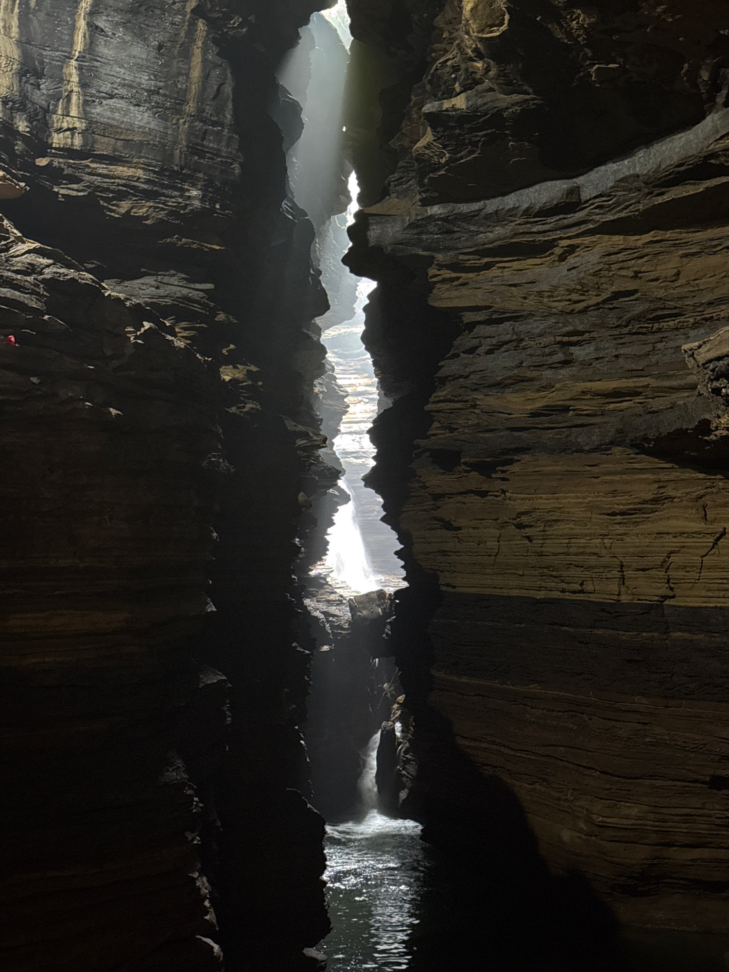 The image depicts the Bat Cave in Pokhara, Nepal. It features a dark, cavernous interior with rocky walls and ceiling. Sunlight penetrates the cave through openings, creating beams of light. A water f…read more