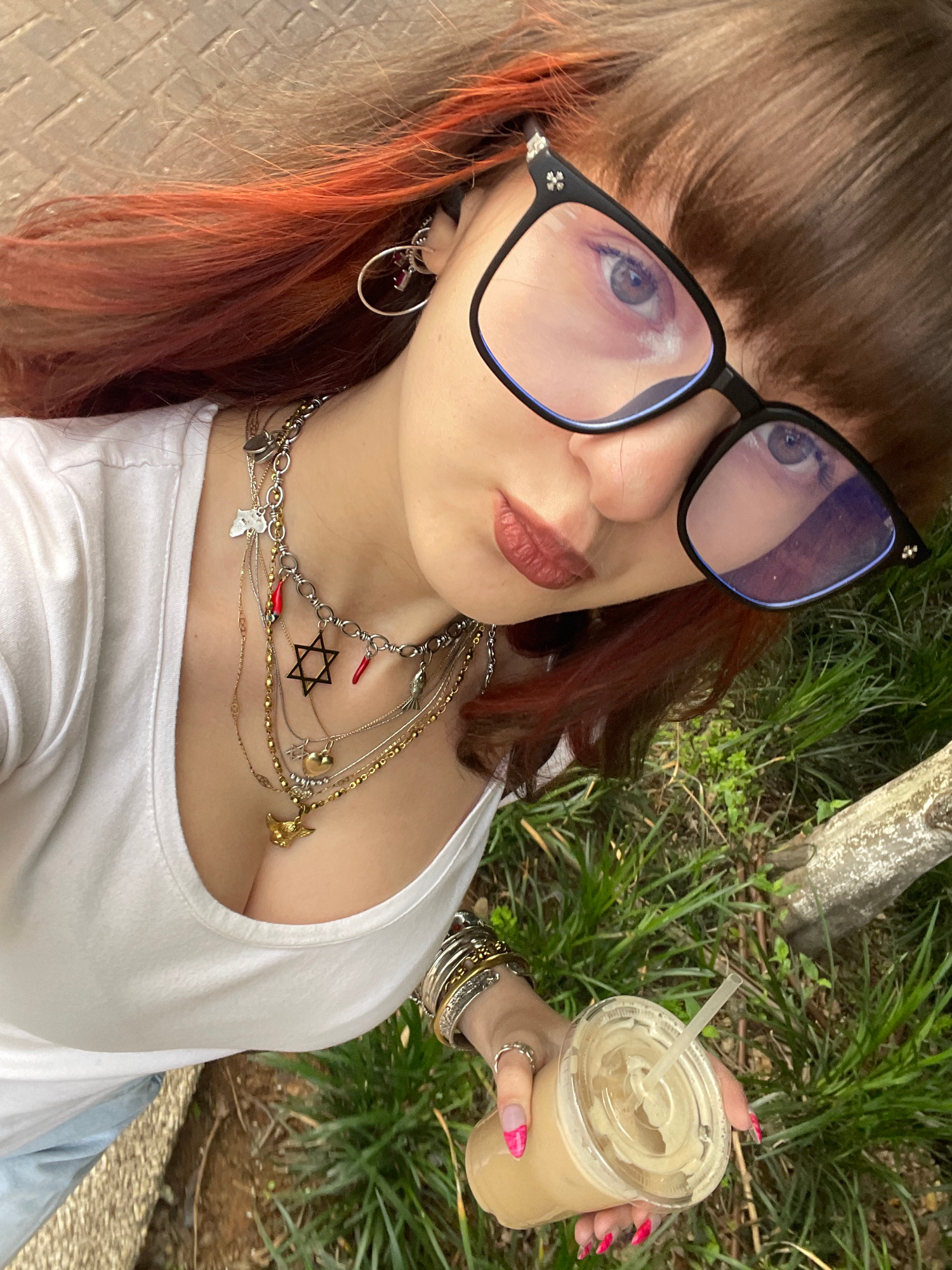 A woman takes a selfie outdoors. She wears oversized black-framed glasses with a light blue tint, a white top, multiple silver and gold necklaces, and bracelets. She holds a plastic cup with a straw,…read more