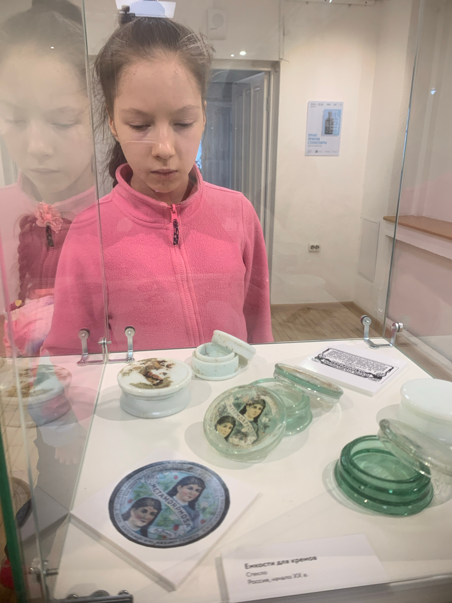 A photograph shows a young girl in a pink fleece jacket looking at a display case in a museum. The display case contains various small, circular containers, some made of clear glass, and others appear…read more
