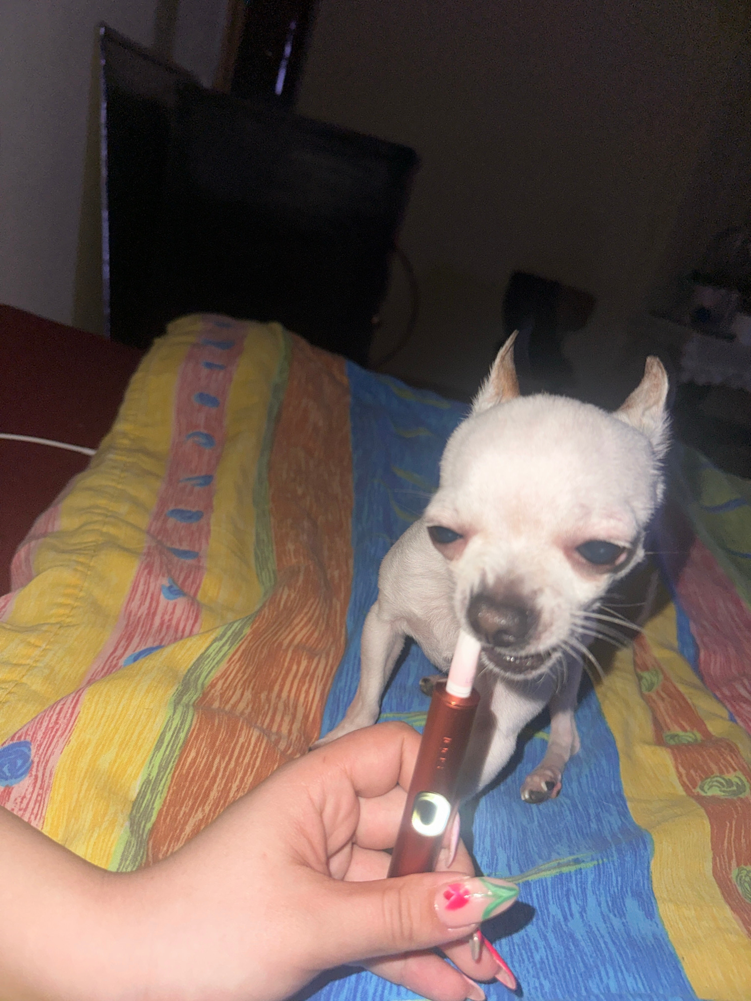 A small, white chihuahua puppy is lying on a multi-colored bedspread. The dog is biting down on the mouthpiece of a brown electronic cigarette held by a person's hand. The person's hand, with long finβ¦read more