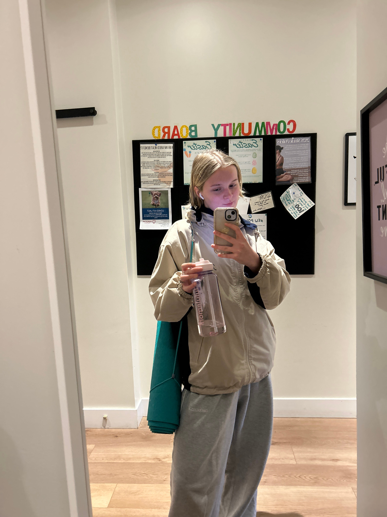 A fair-skinned young woman with short blonde hair holds a smartphone in her left hand, taking a selfie in front of a bulletin board with colorful lettering spelling "COMMUNITY BOARD" in a bright, wellโฆread more