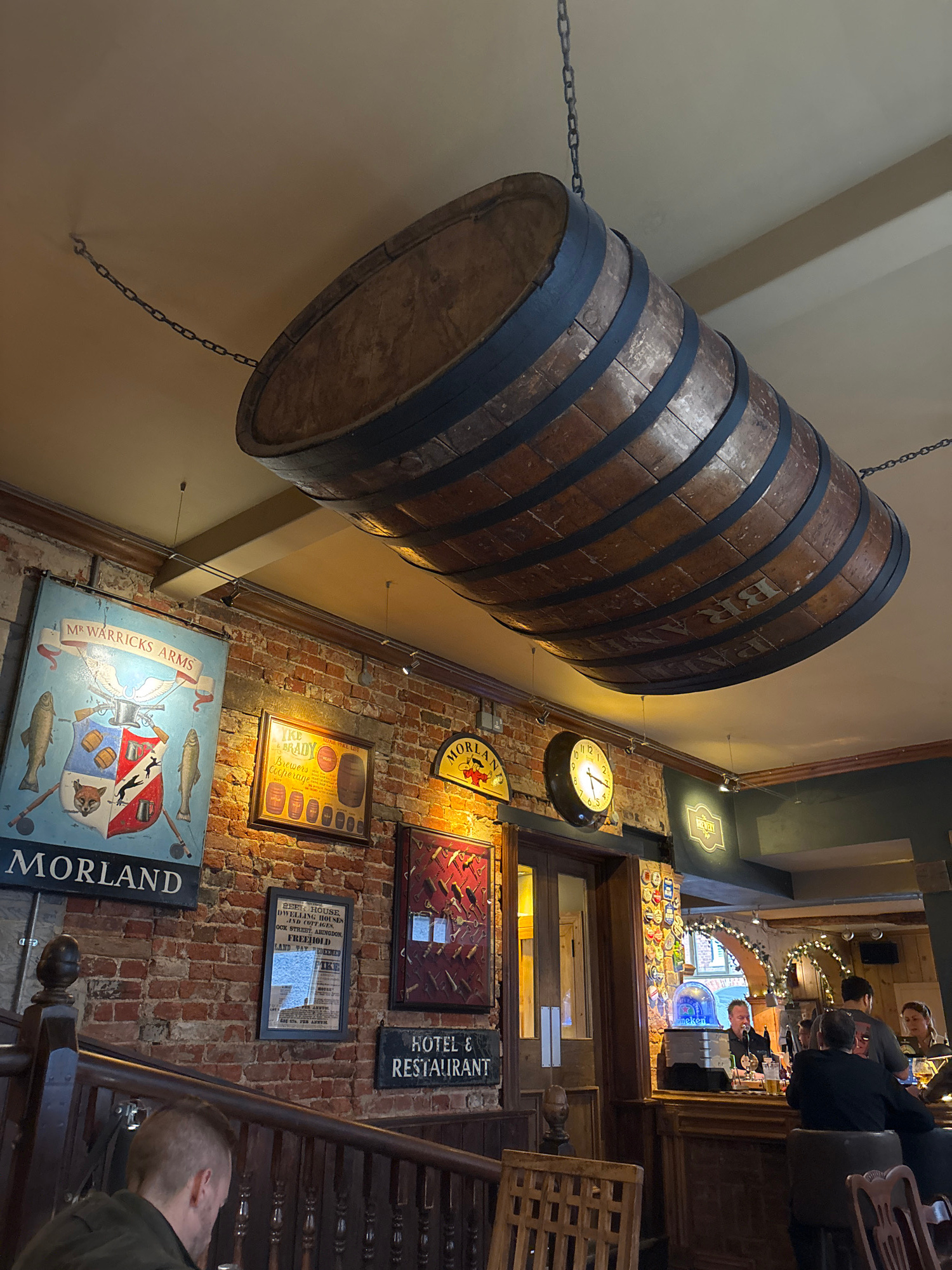 The image shows the interior of a pub in the Vale of White Horse, United Kingdom. A large, wooden barrel hangs from the ceiling by chains. On the brick wall are various signs and framed pictures, incl…read more