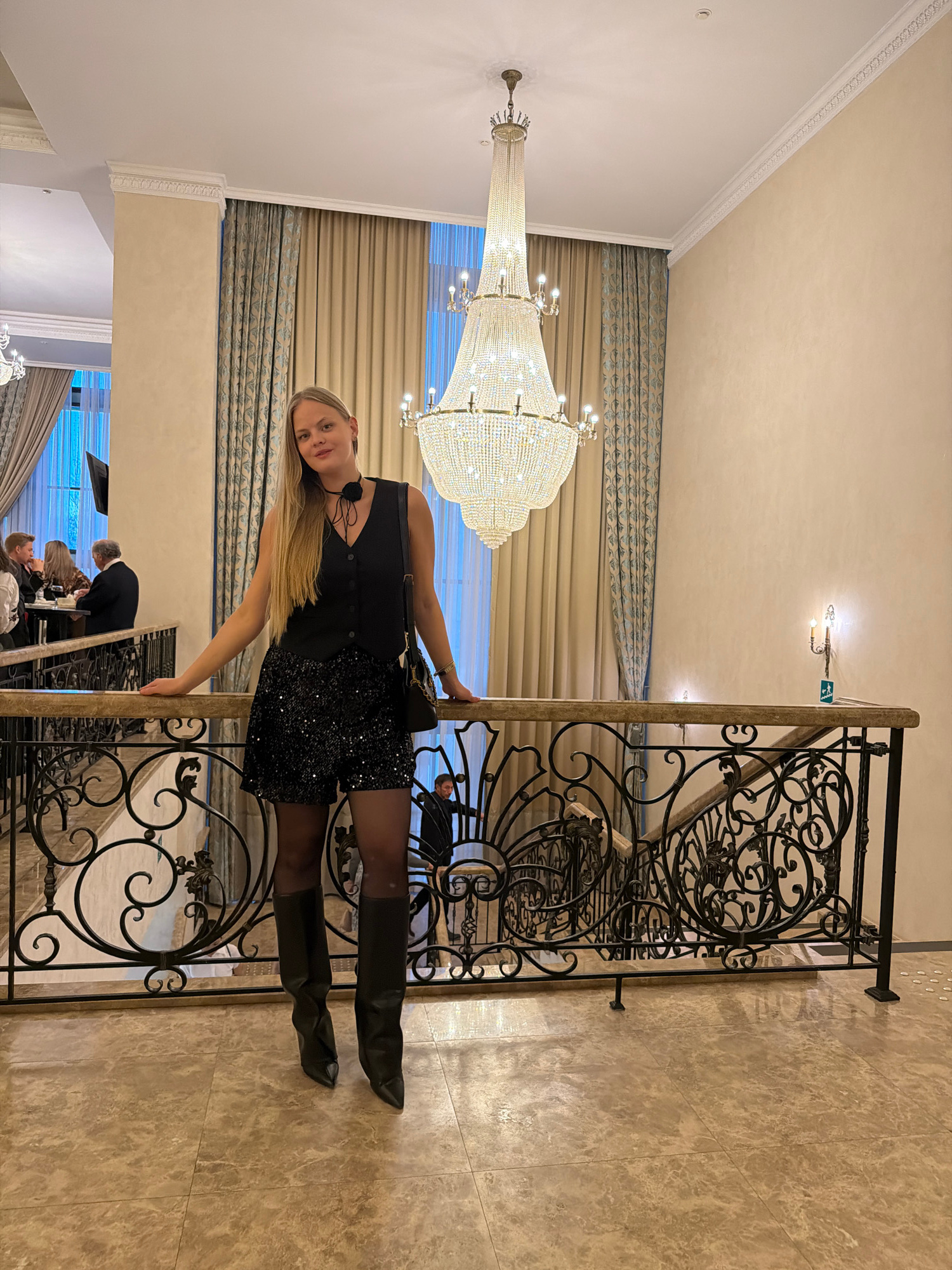A woman in a black dress and boots stands on a staircase in a building in Izhevsk, Russia. The staircase has an ornate metal railing. Behind her, there is a large chandelier and patterned curtains. Ot…read more