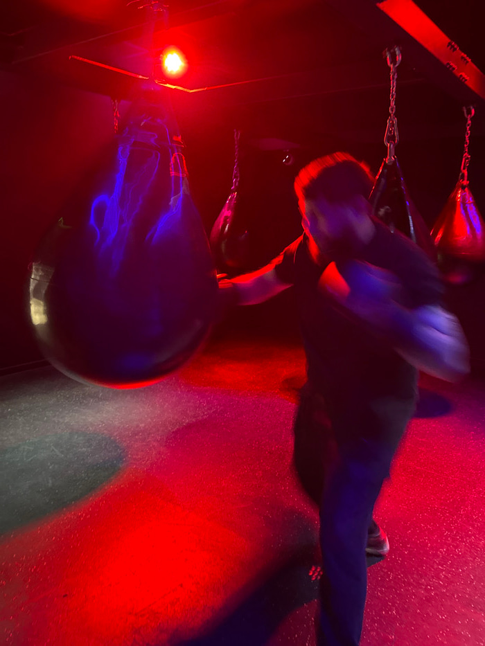 The scene depicts an interior view of a boxing or fitness studio located in Strasbourg, France. The environment is dimly lit by artificial sources, with strong red illumination originating from overhe…read more