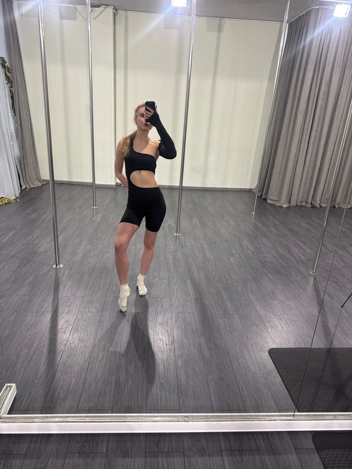 The image shows an indoor studio space in Unknown, Unknown. A lone female subject, with blonde hair in a ponytail, is reflected in a large mirror, posing for a self-photograph. She is wearing a black,…read more