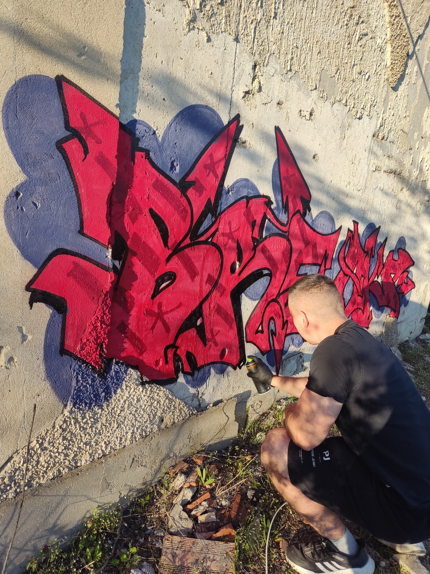 A man is spray-painting graffiti on a concrete surface. The graffiti is red with black outlines and a blue underlay. The man is wearing black shorts with the letters "PJ" on them, a black shirt, and gā¦read more