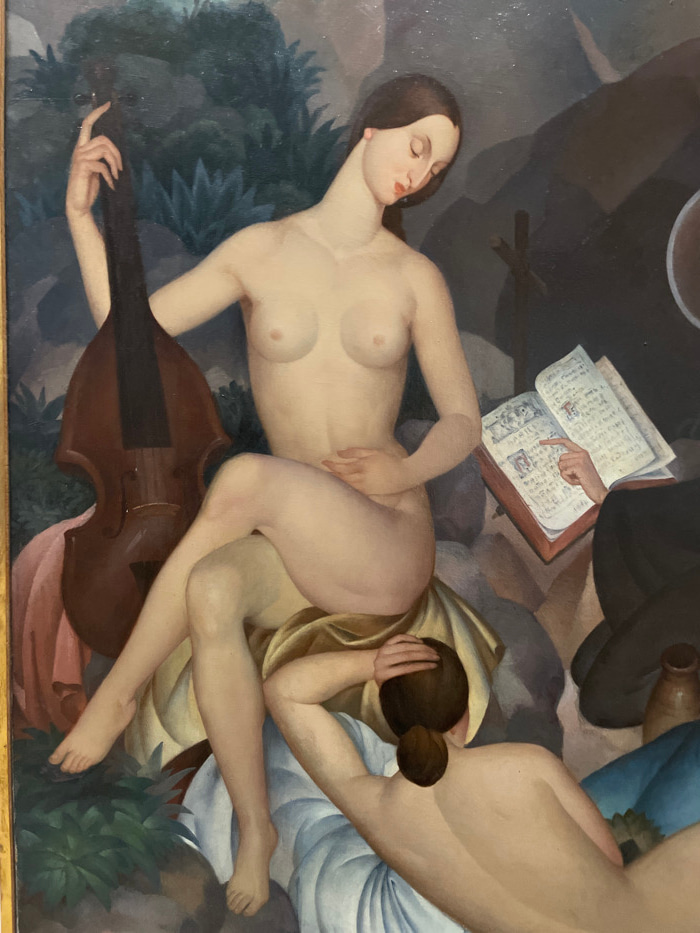 This media file displays a classical-style painting, likely an allegorical or mythological scene. The central figure is a fair-skinned, dark-haired nude woman, reclining with her eyes closed, exuding…read more