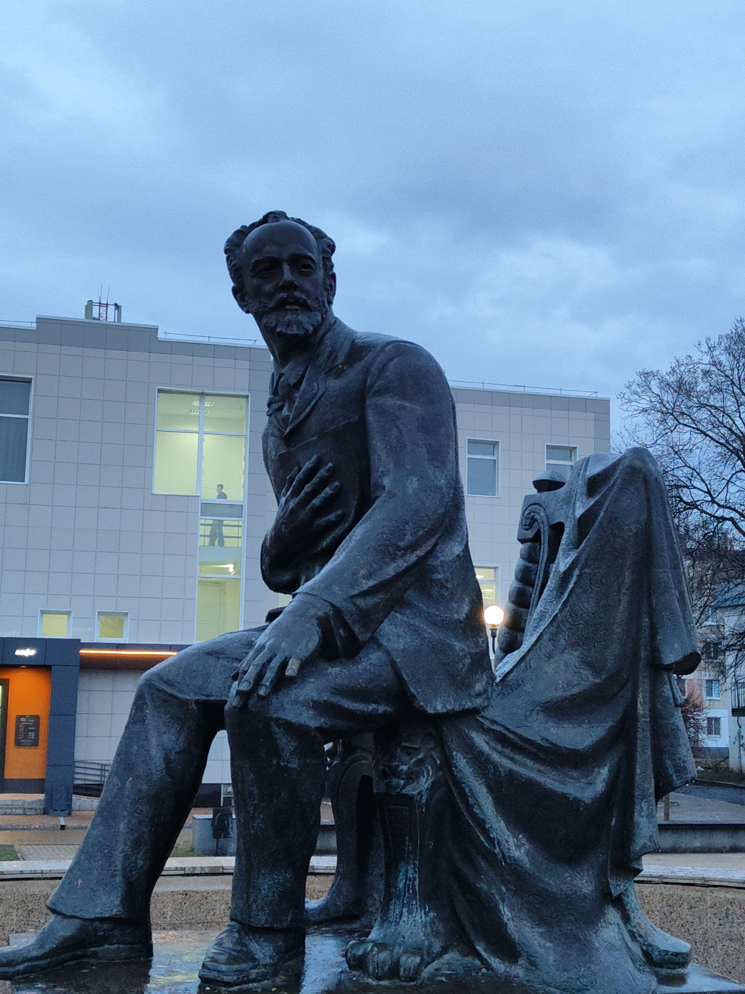The image shows a bronze statue of a bearded man in a suit, sitting on an ornate chair. The man's left hand rests on his chest, while his right hand is placed on his lap. A draped cloth hangs over the…read more