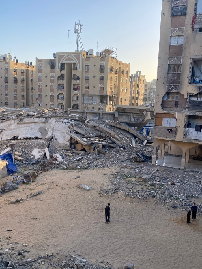 The image presents a desolate urban landscape marked by extensive destruction. Multiple multi-story buildings, constructed primarily of concrete, dominate the scene. Many of these structures exhibit s…read more