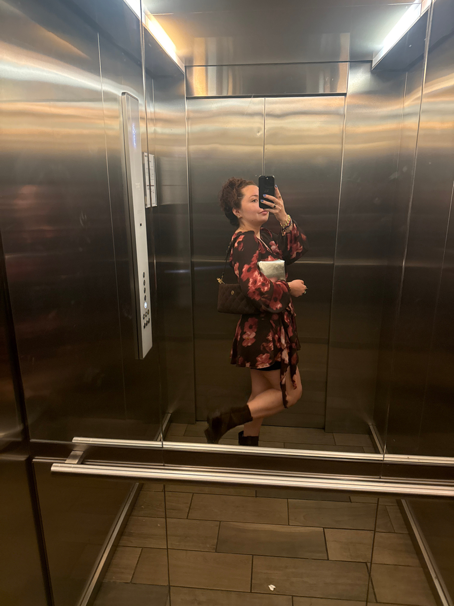 A woman with curly hair stands in an elevator, holding a black smartphone up in her left hand and taking a selfie. She's wearing a dark, floral-patterned dress and brown heeled boots, and she carries…read more