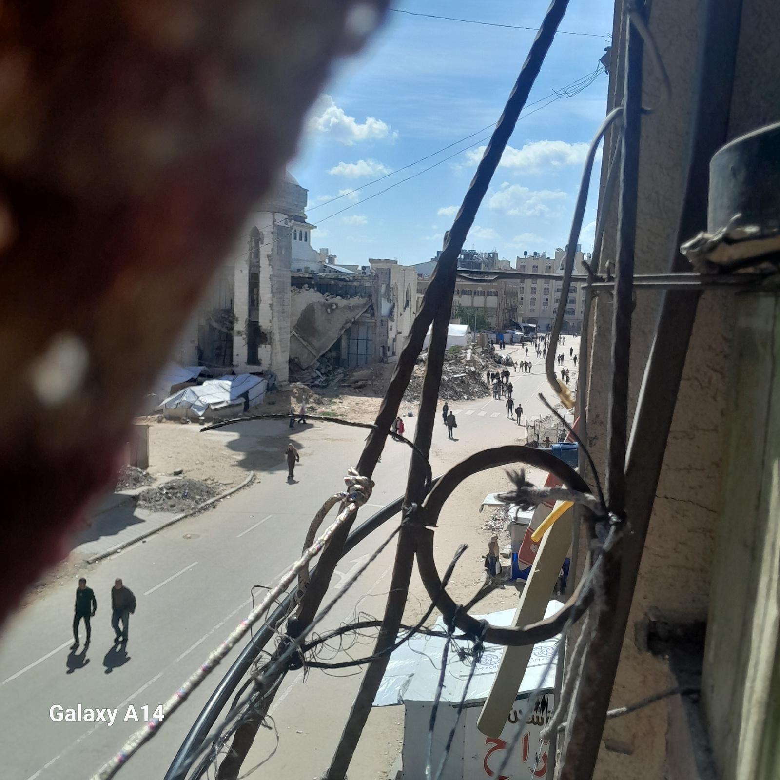 A damaged building in Khan Yunis, Palestinian Territory, is visible in the background. Debris is scattered along the street. Several individuals are walking down the street. Overhead, there are metalβ¦read more