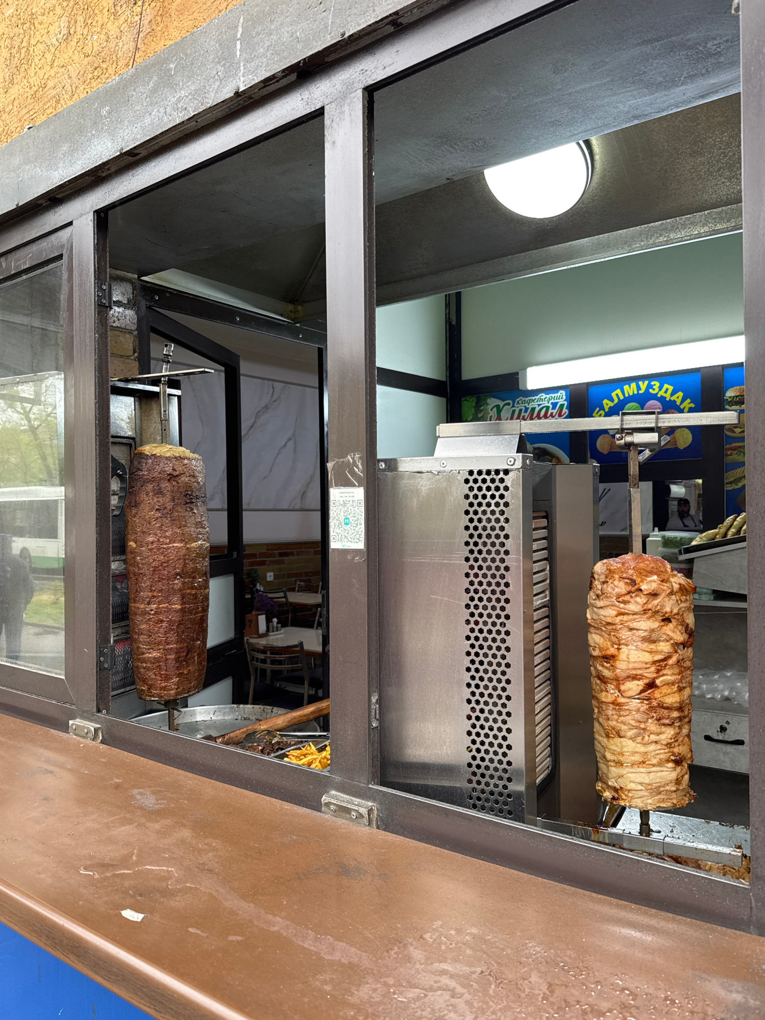The image captures the interior of a food stall or kiosk, likely viewed through a service window or opening, in Bishkek City, Kyrgyzstan. Two vertical rotisseries dominate the scene, each holding a la…read more