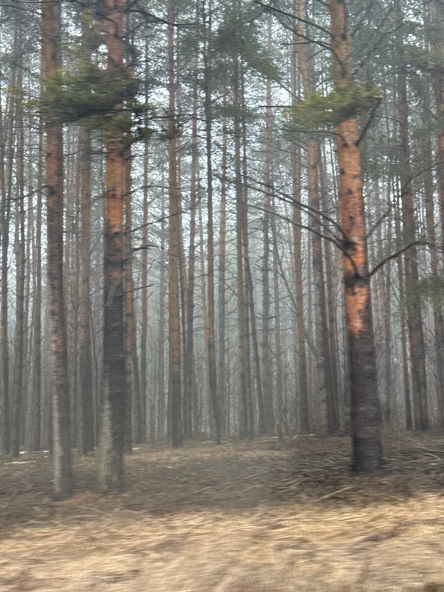 The image depicts a forest scene in a location that appears to be near Votkinsk, Russia. The scene is characterized by dense trees, some with reddish-brown bark. The trees are predominantly bare excep…read more