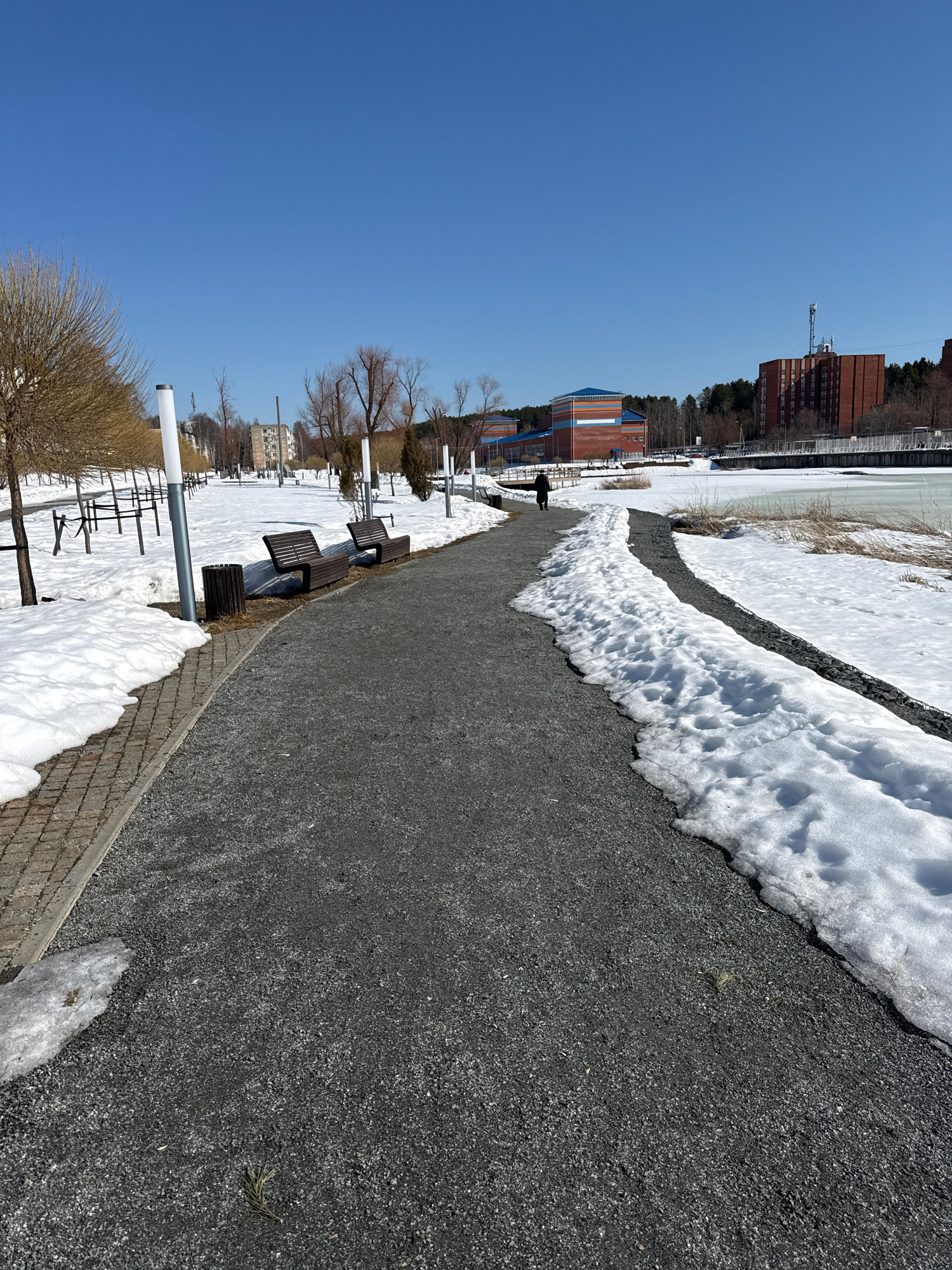 The image depicts a path in Votkinsk, Russia, partially covered with snow, suggesting a winter or early spring scene. The path is paved with small, dark gravel and is flanked by snow on both sides. In…read more