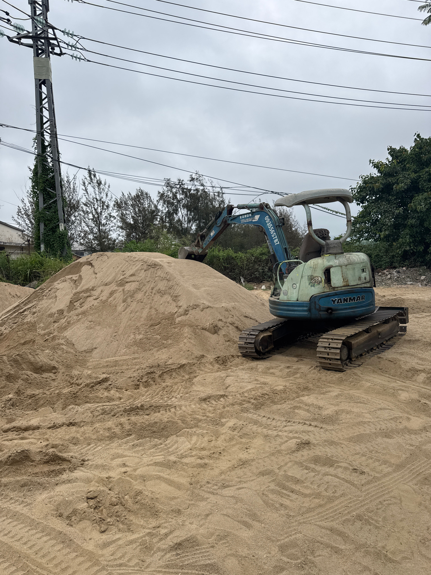 A small, blue-and-white Yanmar excavator sits atop a large pile of sand. The excavator is positioned such that its tracks are visible on the right side of the frame. The machine's arm extends out, but…read more