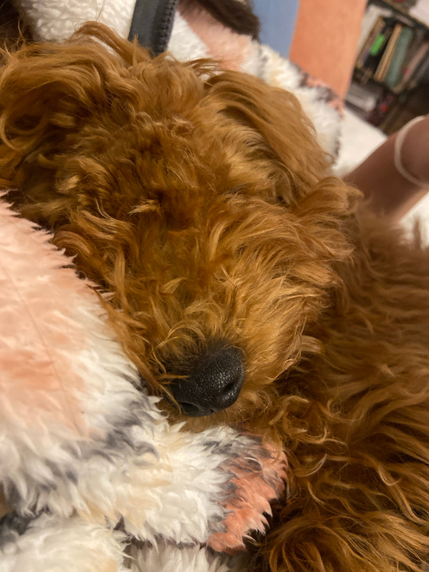 A close-up photograph depicts a reddish-brown dog, possibly a Goldendoodle, resting its head on a multicolored blanket of white, gray, and pink hues. The dog’s black nose is prominently featured. The…read more