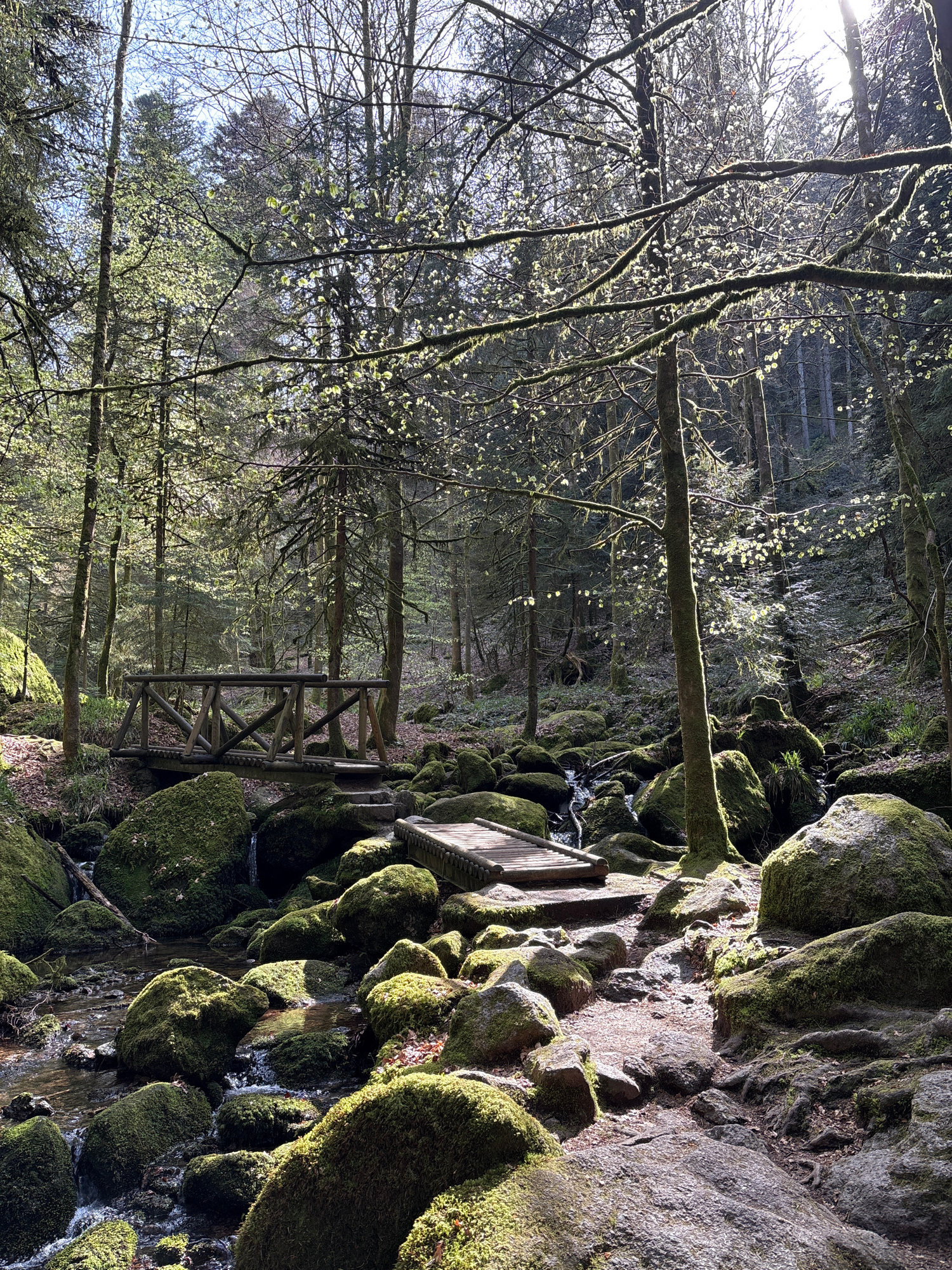 The image depicts a scene in the Bühlertal forest, Germany. A small wooden bridge spans a rocky stream covered in moss, with trees lining the background. The sun filters through the tree branches, cas…read more