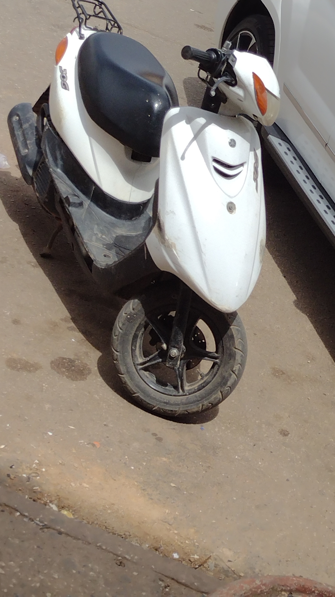 A slightly elevated shot reveals a white Yamaha Jog scooter parked on a paved, dirt-streaked surface in Jos, Nigeria. The scooter, angled with its front wheel pointing upwards, is positioned next to a…read more