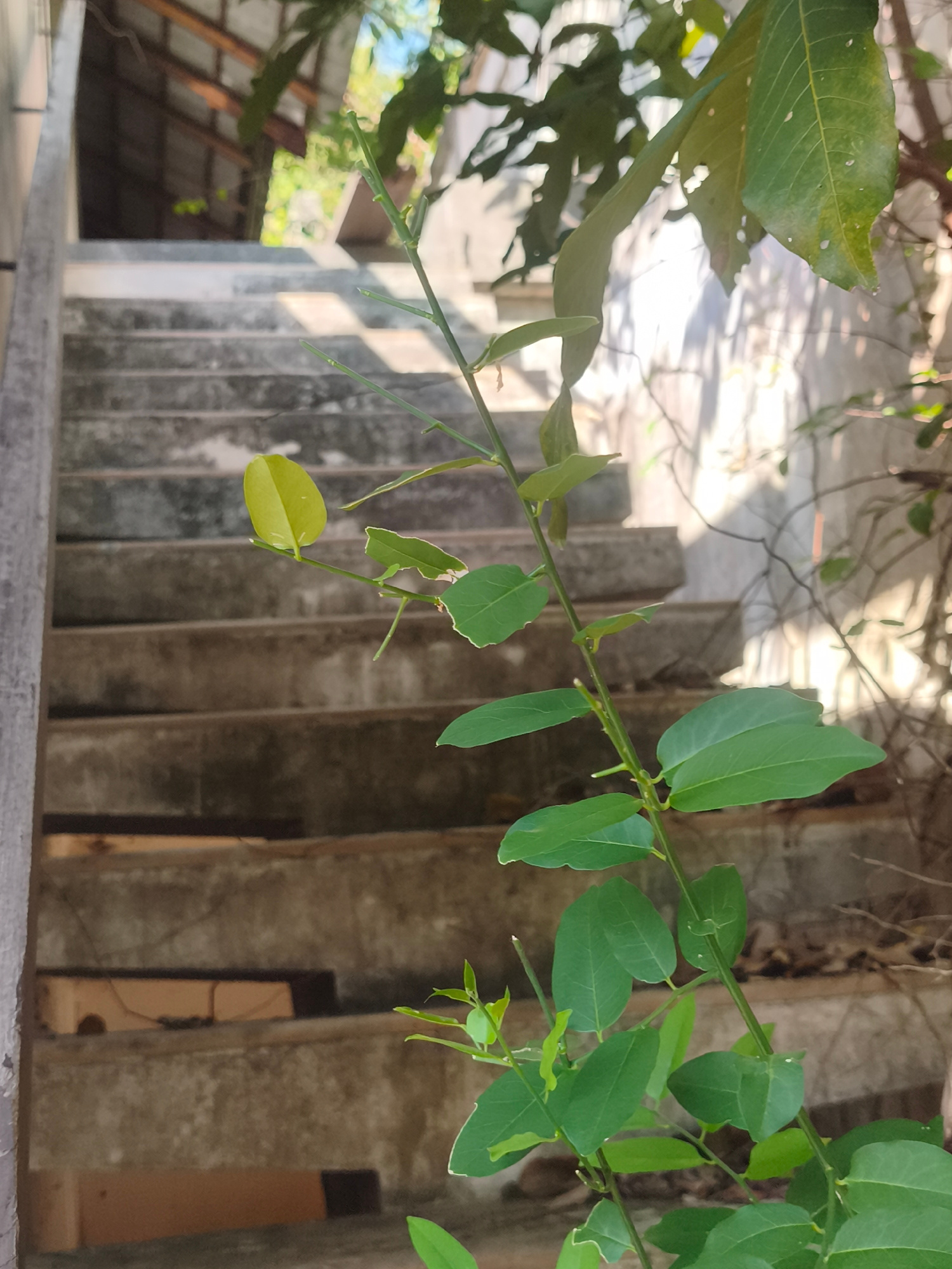 The image shows a concrete staircase with a green vine in the foreground. The staircase is weathered and shows signs of age. The vine has small, green leaves and is growing up along the side of the st…read more