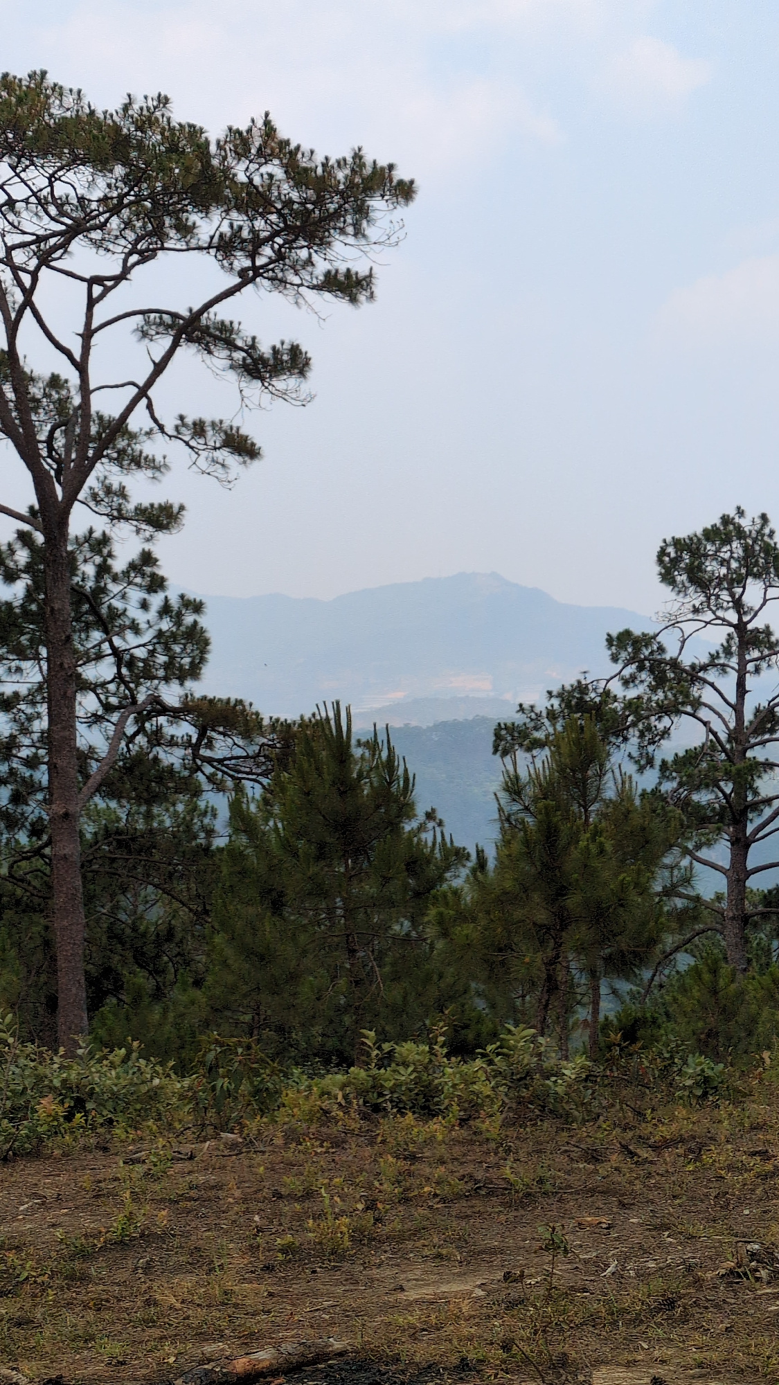 A landscape shot in Lang Biang - Da Lat, Vietnam shows a mountainside vista under a hazy sky. Trees with dense foliage frame the view, positioned on the right and left sides. The earth slopes down fro…read more