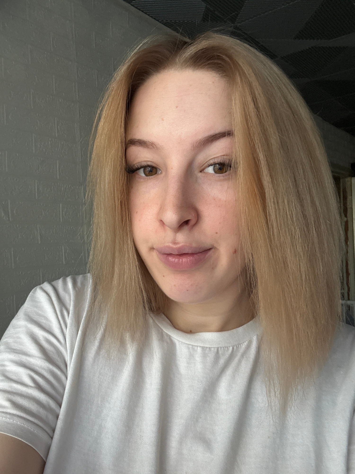 A close-up portrait shows a young woman with fair skin and light blonde hair, appearing to be taken indoors. She looks directly at the camera with a gentle, closed-mouth smile. Her brown eyes are prom…read more