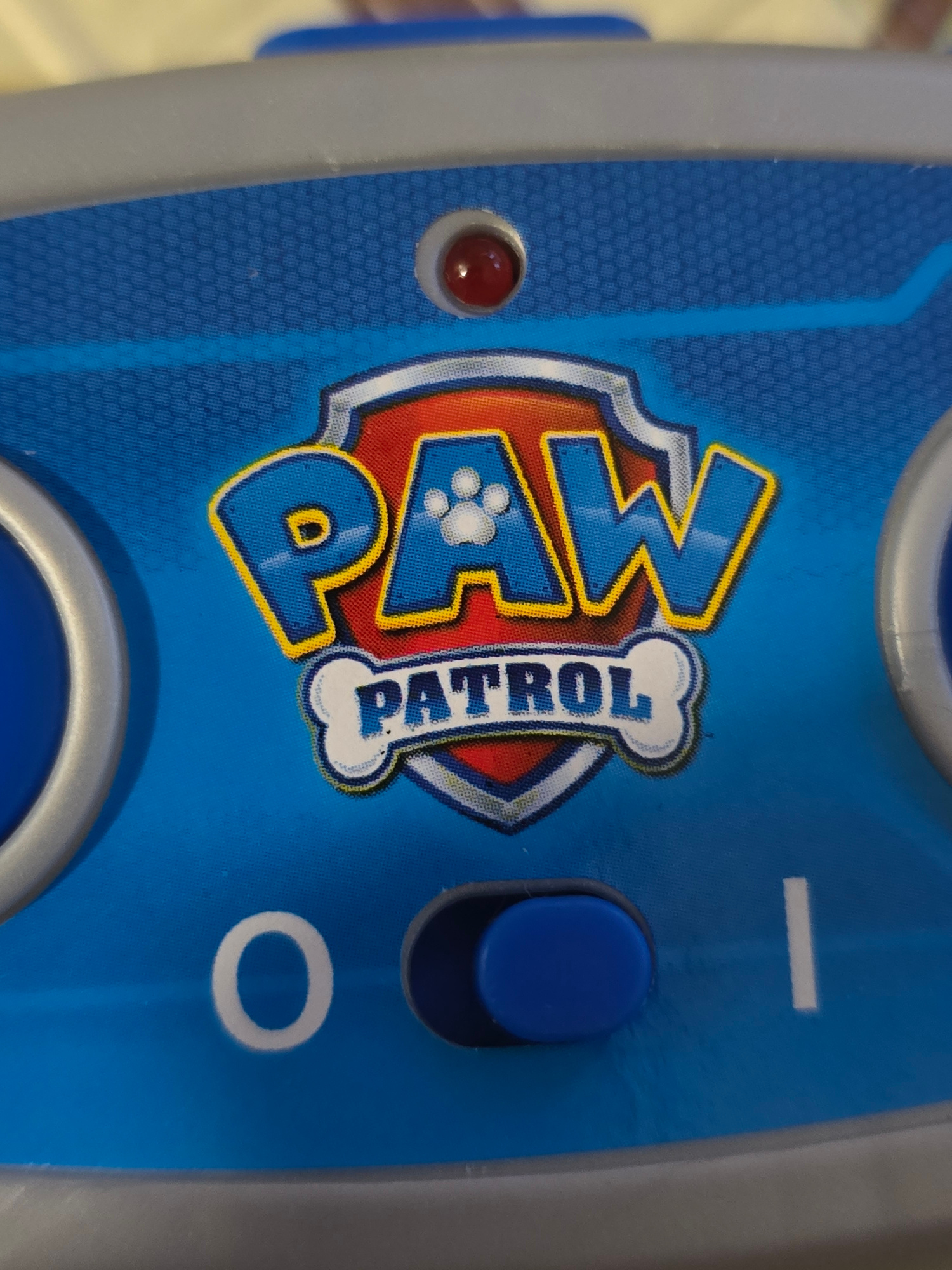A close-up, slightly angled photograph showcases a section of a blue electronic device, likely a child's toy or controller, framed by a grey/silver plastic casing. The vibrant blue surface is adorned…read more