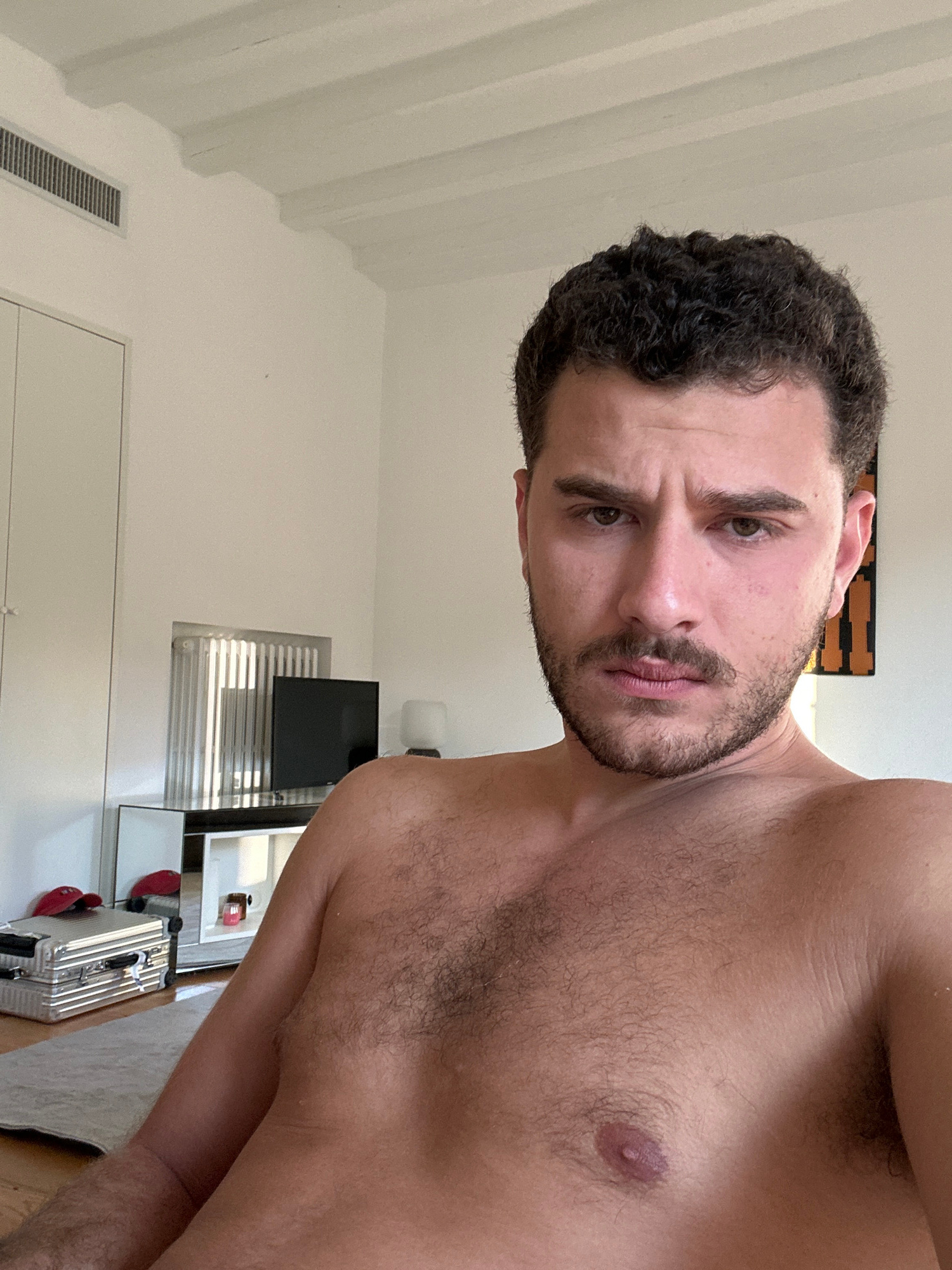 A torso-up view of a shirtless man, positioned at an angle, looking directly at the camera with a serious expression. He has short, dark curly hair and a trimmed beard. The background consists of a wh…read more