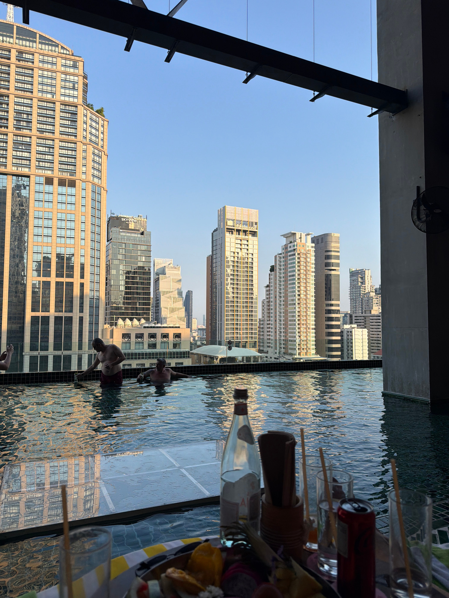 The image depicts a rooftop swimming pool area overlooking the Sukhumvit cityscape in Bangkok, Thailand. The scene is illuminated by daylight under a clear blue sky. In the immediate foreground, posi…read more