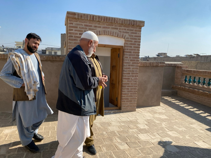 The image displays three adult males on a tiled rooftop in Kandahar, Afghanistan, under a clear blue sky. The man on the left, with a dark beard, wears a light blue shalwar kameez, a brown vest, and a…read more