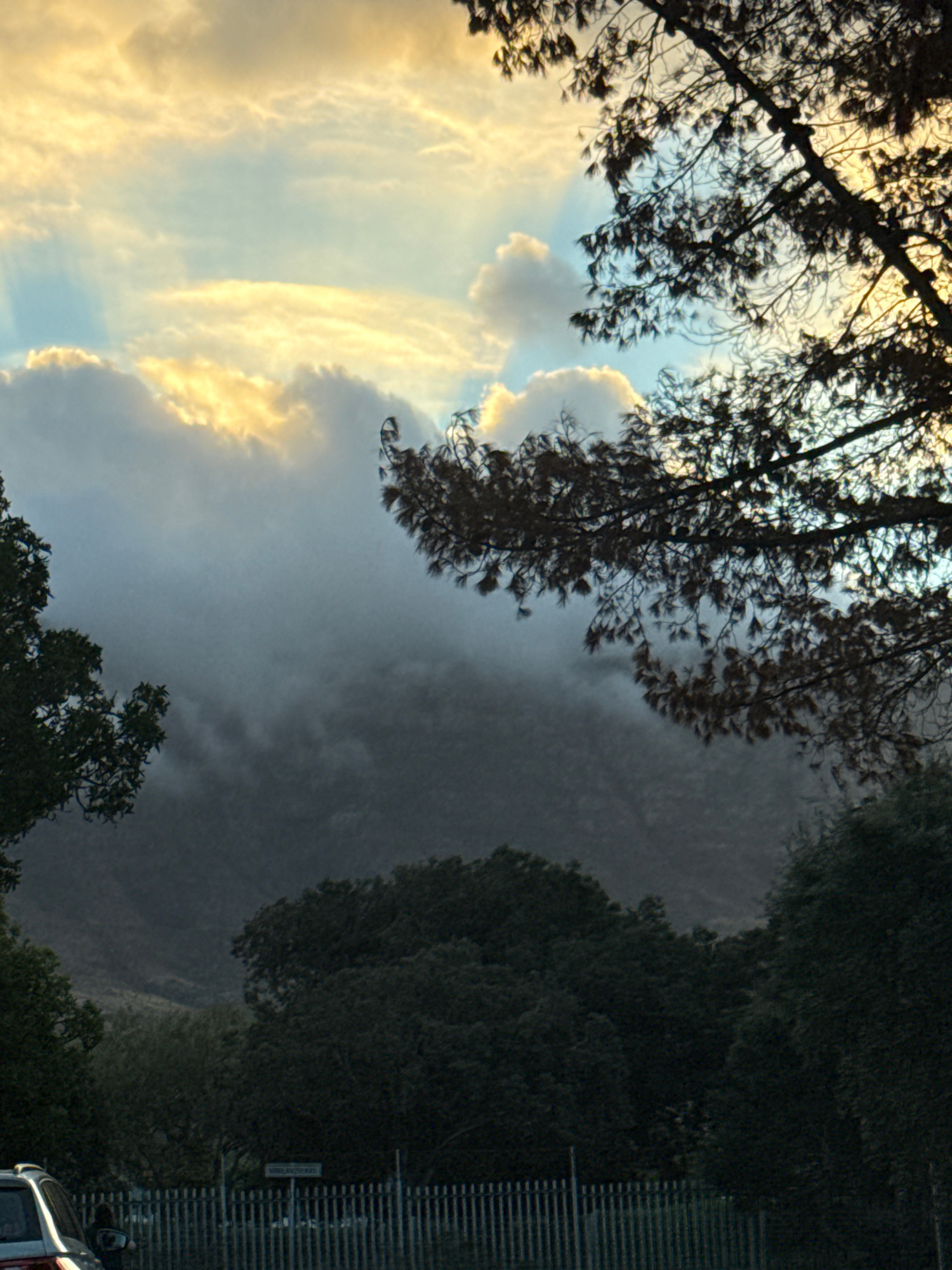 The image depicts a scene in Cape Town, South Africa, viewed through trees. The sky is partially cloudy with some areas illuminated by sunlight. A forested area appears dense and dark. A vehicle and p…read more